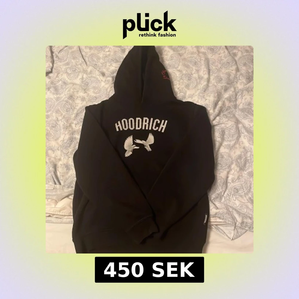 Svart hoodie från Hoodrich med stor vit text och duvor på ryggen. På bröstet finns ett tryck med röda bokstäver 'From Nothing To Something' och vita duvor. Klassisk huva och känguruficka. Perfekt streetwear-vibe. Jag är 170 och den passar mig bra. Skriv för frågor!