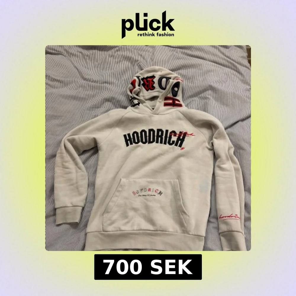 Säljer en vit hoodie från Hoodrich med tryck både fram och bak. Den har en stor ficka framtill och textdetaljer på huvan. Perfekt för en avslappnad stil.