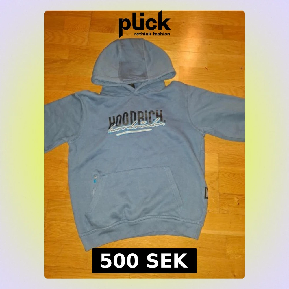 Snygg blå hoodie från Hoodrich med stor logga på bröstet och coolt tryck i svart och vitt. Tröjan har huva, lång ärm och en praktisk ficka med dragkedja framtill. Perfekt för chill dagar och streetwear-stil.