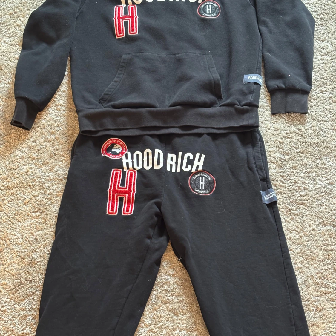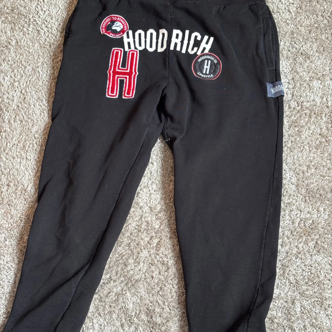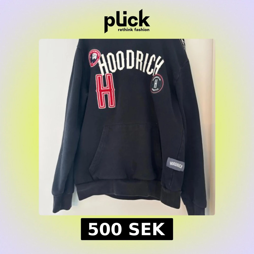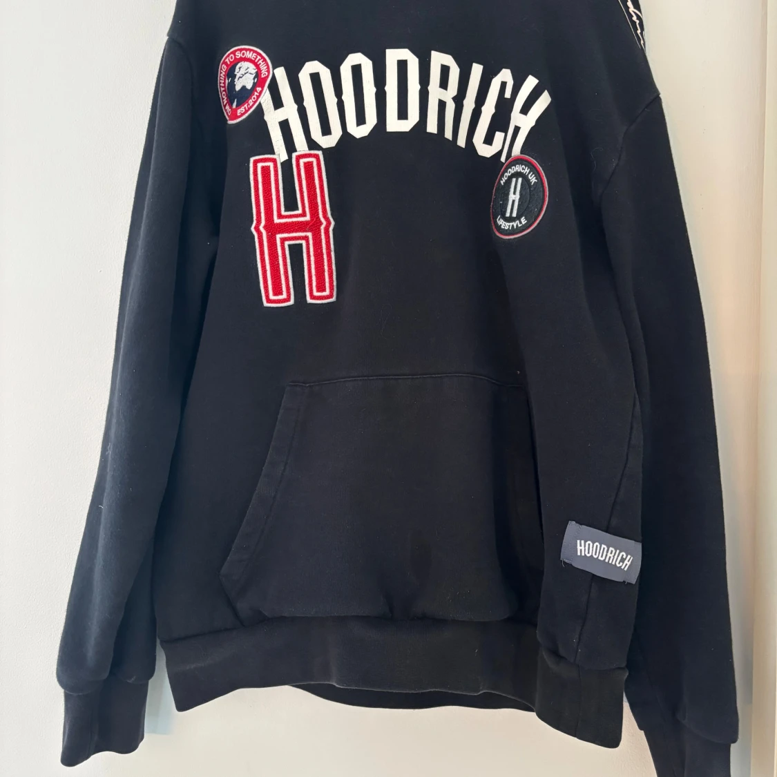 Svart hoodie från Hoodrich med stora broderade patchar och tryck i vitt och rött framtill. Klassisk känguruficka, huva och ribbade muddar. Hoodrich-logga på ärmen och coola detaljer som ger streetkänsla. Perfekt för dig som gillar urban stil.