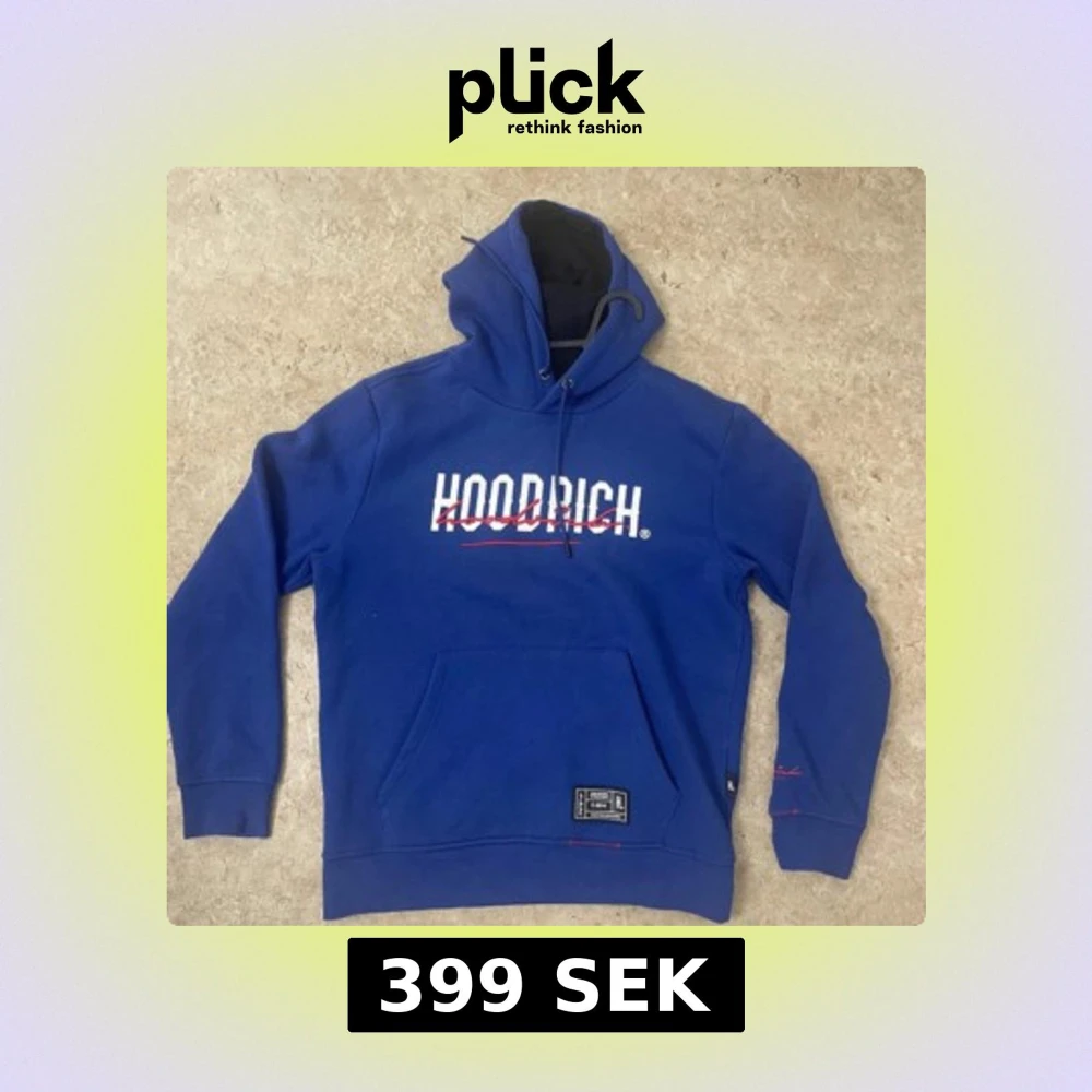 Snygg blå hoodie från HOODRICH med vit och röd logga på bröstet och ryggen. Tröjan har huva med snörning, känguruficka och coola detaljer på ärmen och nederkanten. Perfekt för dig som gillar streetwear och vill sticka ut.