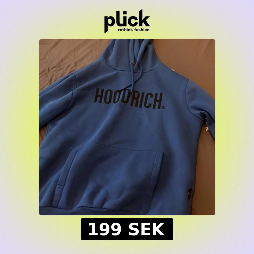 Säljer en blå hoodie från Hoodrich med svart logga på bröstet. Tröjan har huva med dragsko och en stor magficka framtill. Perfekt för en avslappnad stil.