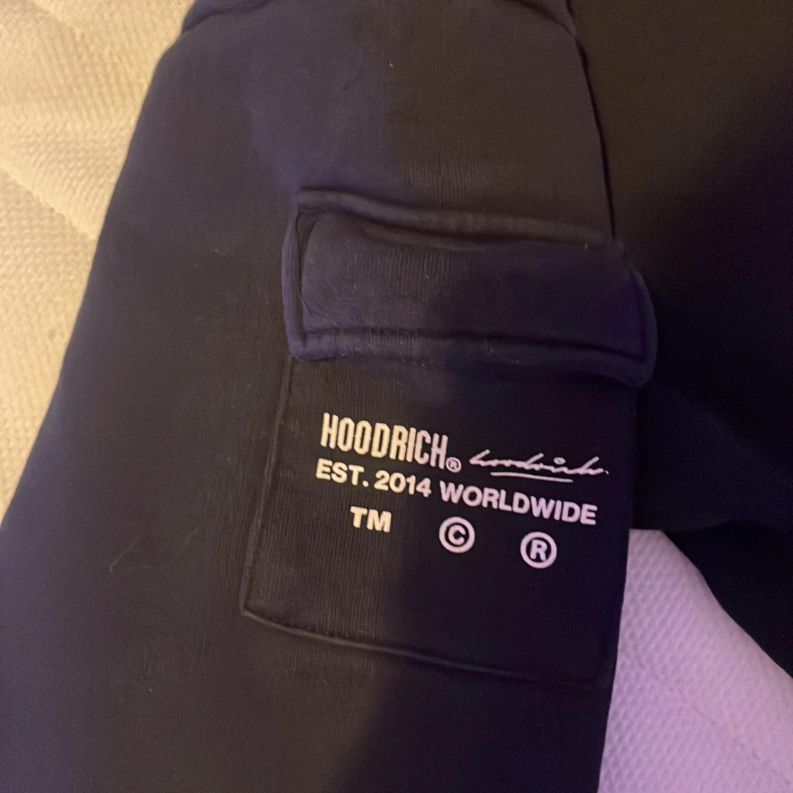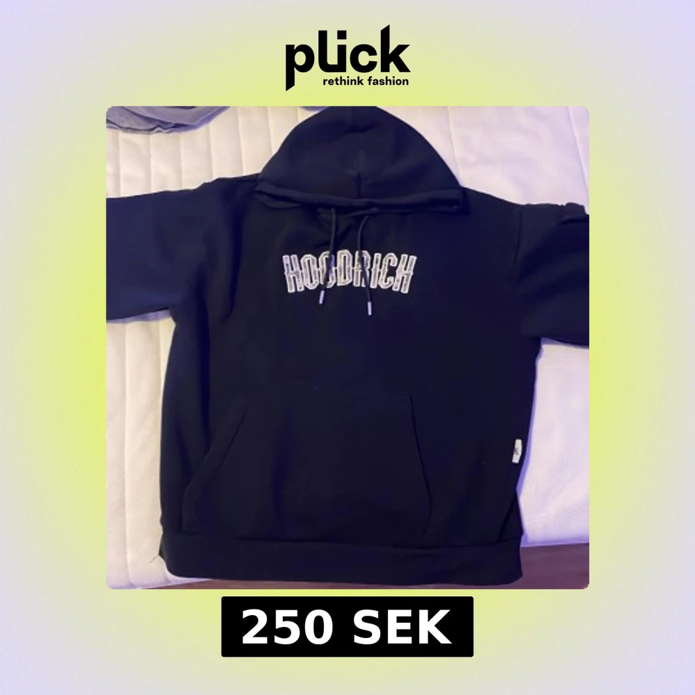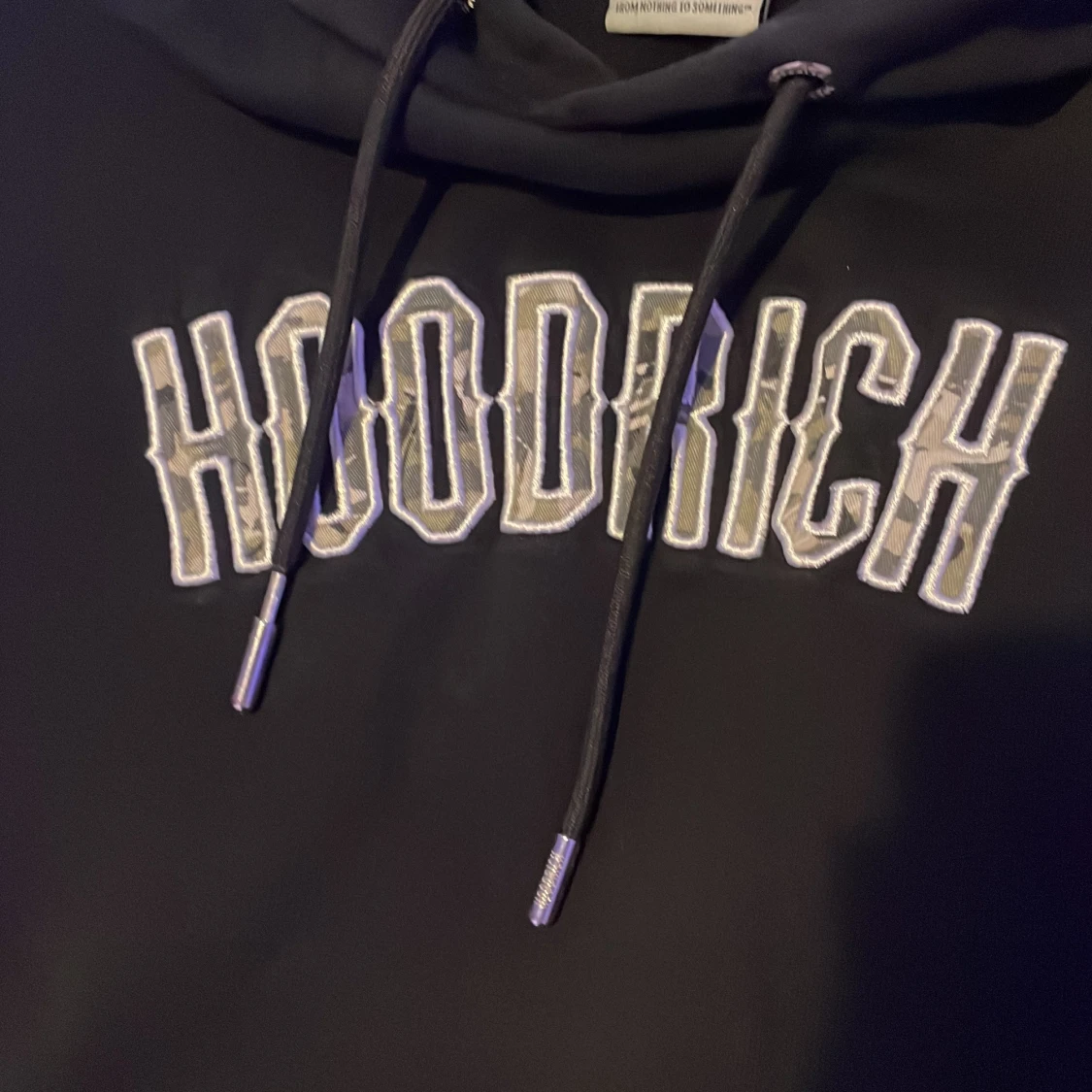 Svart hoodie från Hoodrich med grön/vit kamouflage broderad logga på bröstet och tryck på ena ärmen. Klassisk känguruficka framtill, snörning i huvan och mjukt material. Perfekt för dig som gillar streetwear och vill ha en stilren look. Funkar till alla årstider.