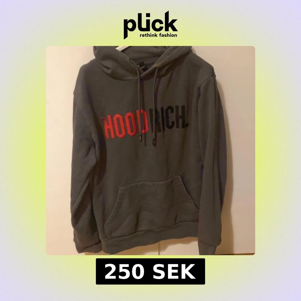 Säljer en grå hoodie från Hoodrich med texten 'HOODRICH' i rött och svart på bröstet. Tröjan har en klassisk känguruficka och justerbar huva med dragsko. Perfekt för en avslappnad stil.
