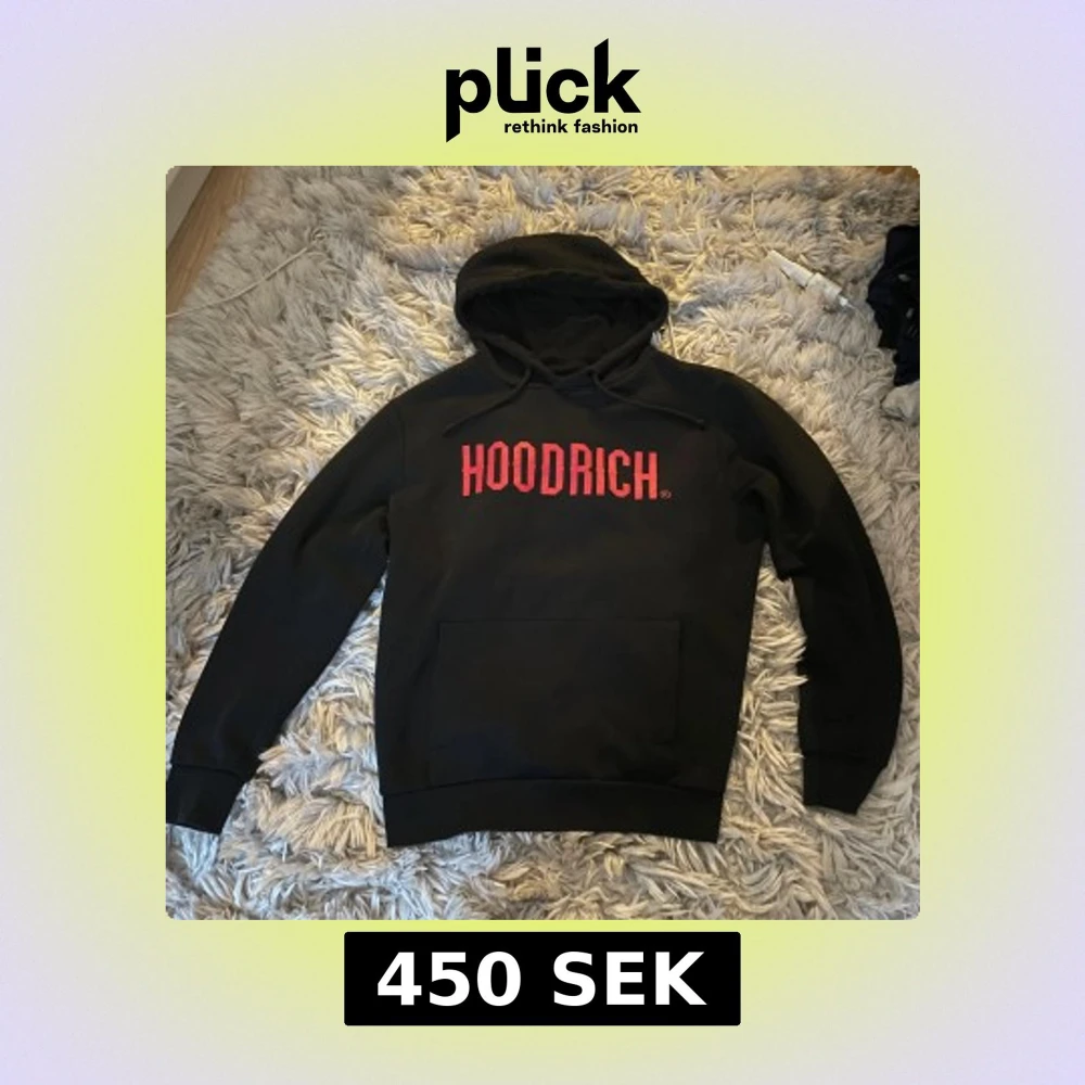 Svart hoodie från Hoodrich i storlek medium med stor röd logga på bröstet. Klassisk känguruficka framtill, huva med snörning och mjukt material som känns skönt mot huden. Perfekt för dig som gillar streetwear och vill sticka ut med en fet logga.