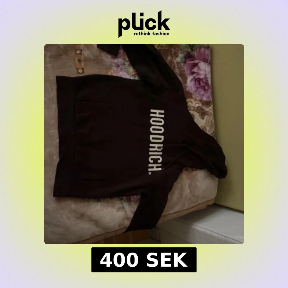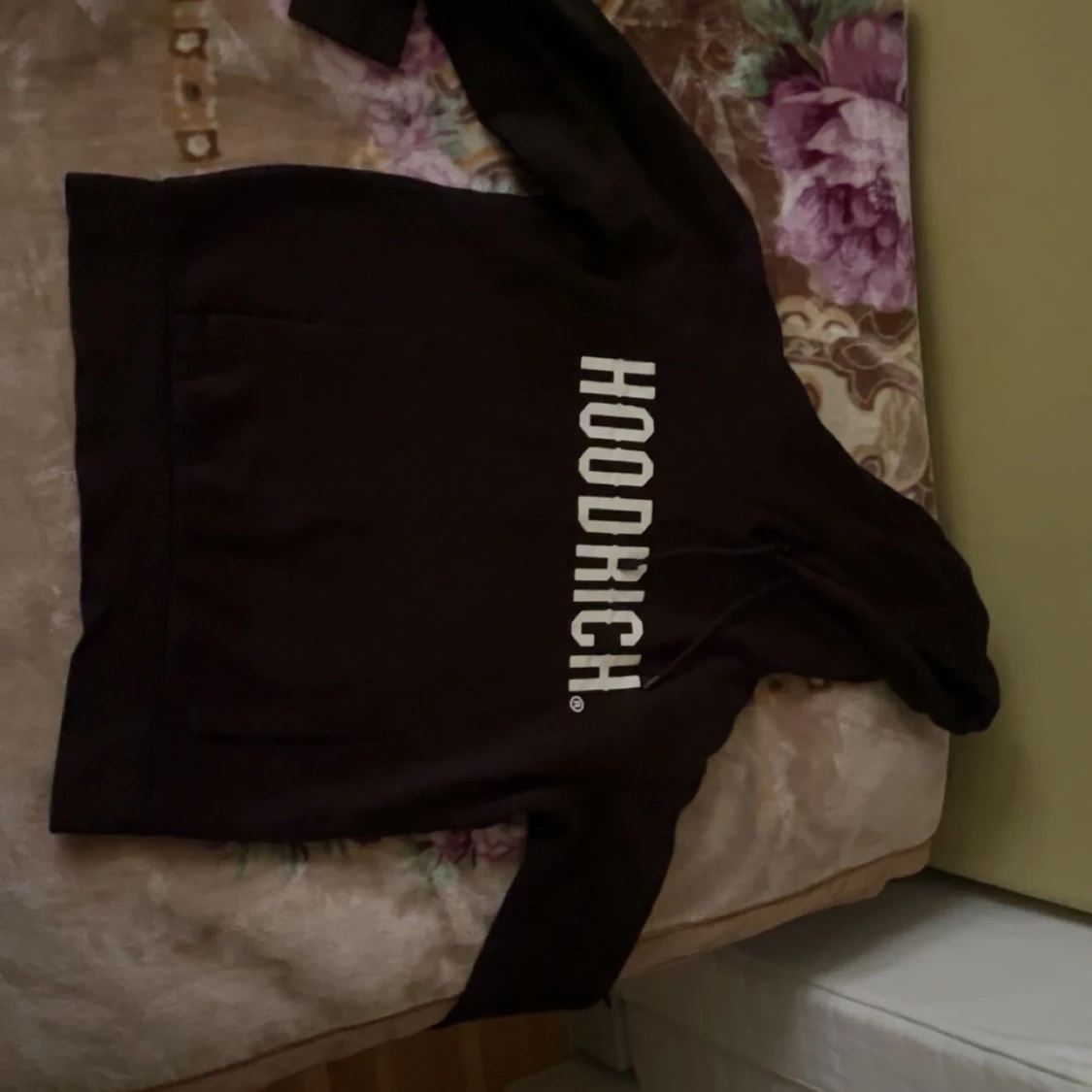 Svart hoodie från HOODRICH med stor vit logga tryckt vertikalt på framsidan. Klassisk känguruficka, huva med snörning och långa ärmar. Perfekt för en streetwear-look och chill dagar.