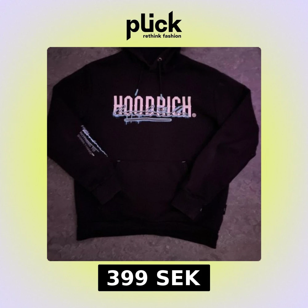 Svart hoodie från Hoodrich i storlek M med stor vit och blå logga på bröstet och texten 'From nothing to something' på ryggen och ärmen. Tröjan har huva med snörning och en klassisk magficka. Perfekt streetwear med coolt grafiskt tryck.