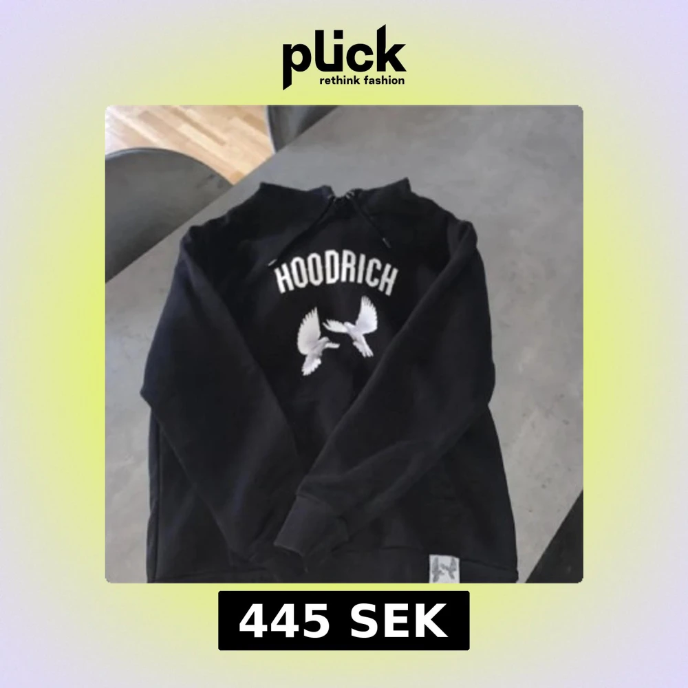 Svart hoodie från Hoodrich med vit text och motiv av duvor på både fram- och baksidan. Baksidan har även blå text 'From Nothing To Something' och vit text 'Product of the Streets Est. 2014'. Tröjan har huva med snörning och ribbade muddar.
