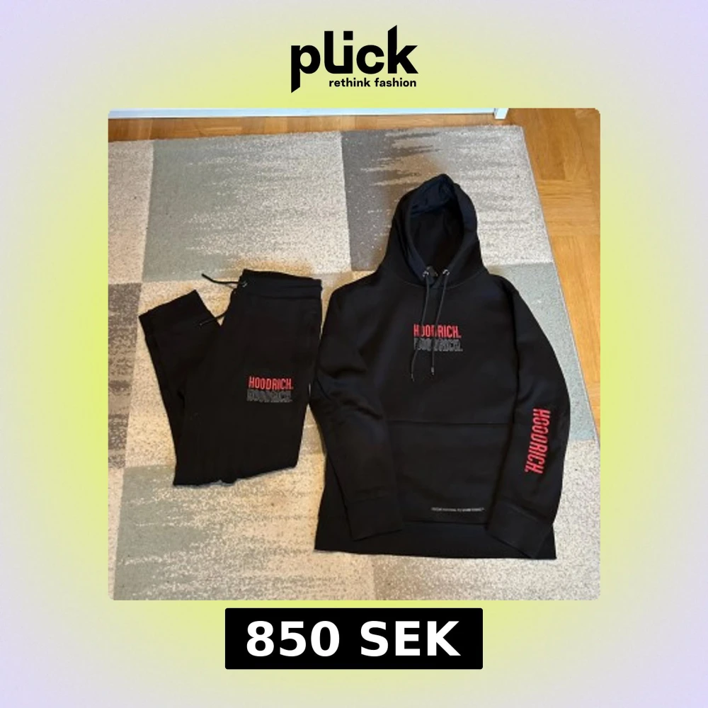 Säljer ett set med svart hoodie och matchande byxor från Hoodrich, de går att köpa separat för rätt pris. Perfekt för en avslappnad stil. 🖤