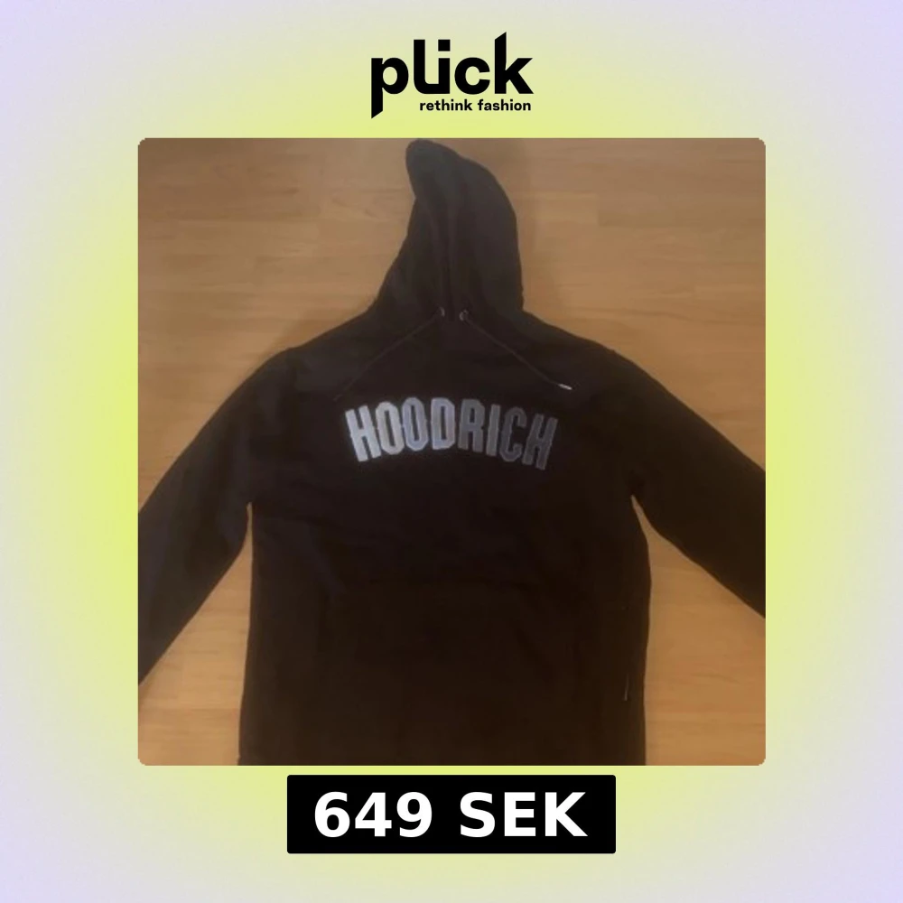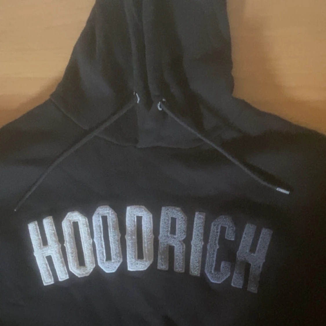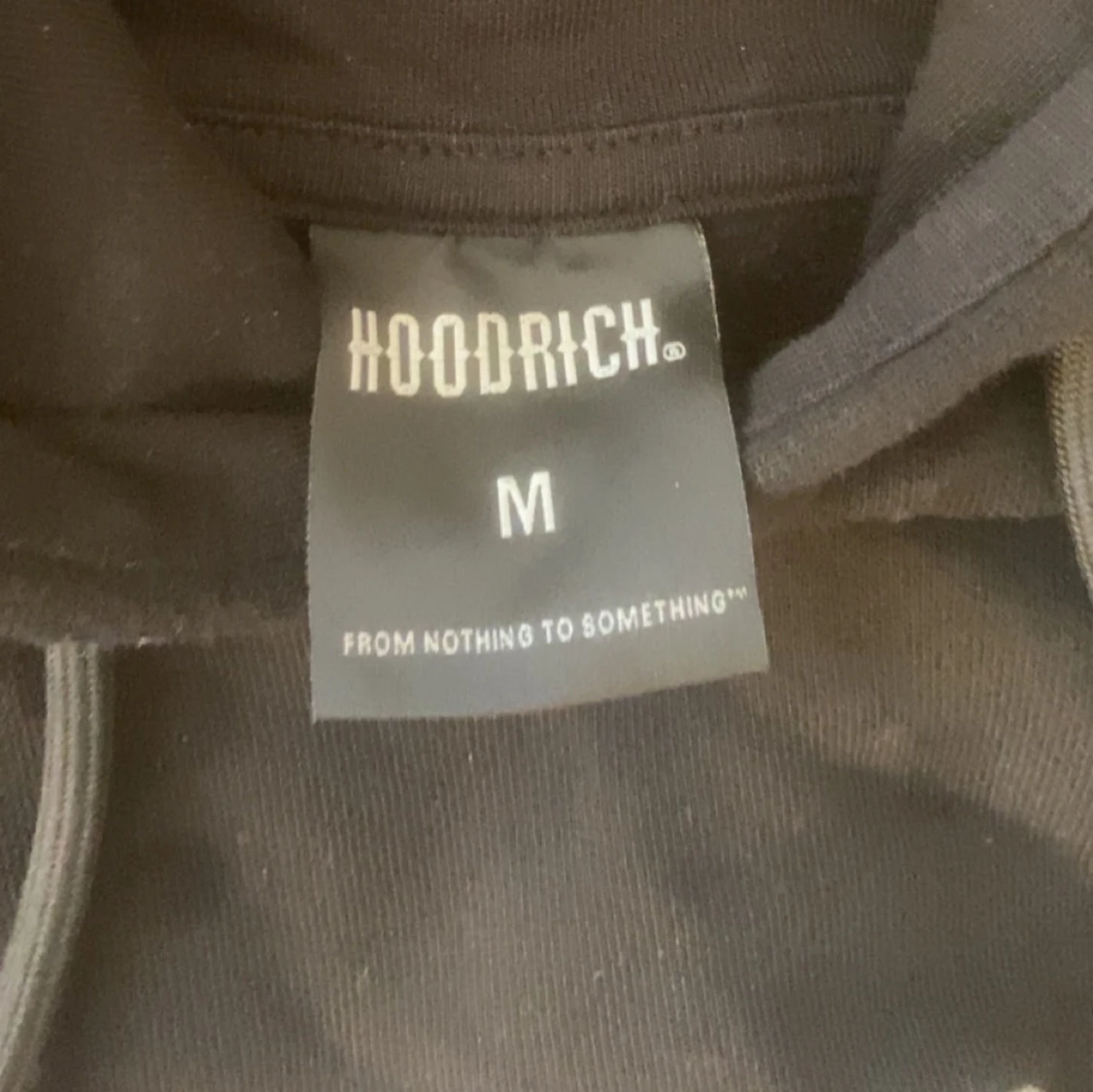 Svart hoodie från Hoodrich i storlek M med stort, vitt och grått HOODRICH-tryck över bröstet. Tröjan har huva med snörning och är långärmad. Materialet är mjuk bomull, perfekt för chill dagar. Snygg streetwear-vibe och klassisk passform.