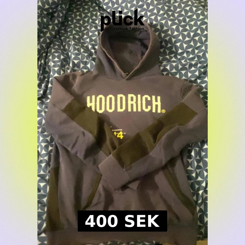 Säljer en svart hoodie från Hoodrich med stor gul logga på bröstet och coolt världskarta-tryck på ryggen. Tröjan har huva, lång ärm och paneler i mörkare svart på ärmar och nedre delen. Perfekt för dig som gillar streetwear och snygga detaljer.