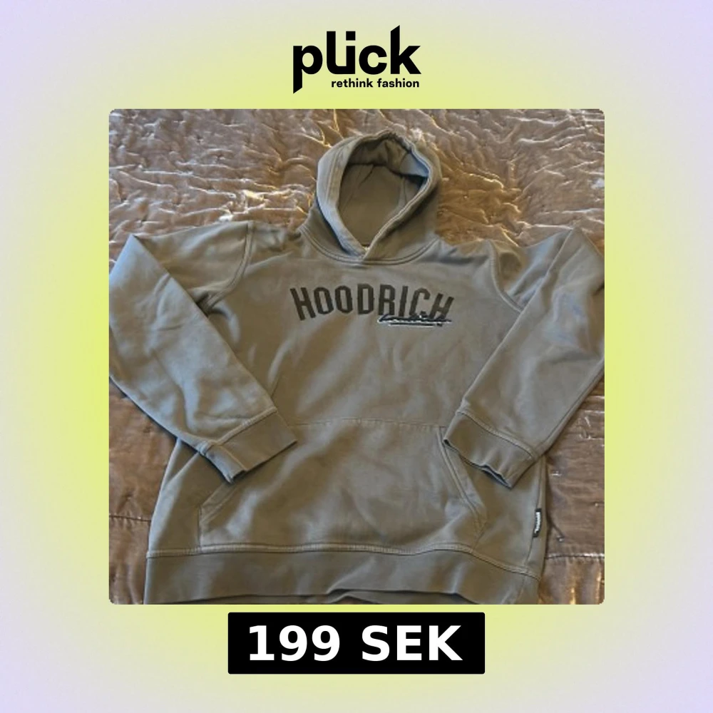 Säljer en grå hoodie från Hoodrich med svart tryck på bröstet och klassisk känguruficka. Tröjan har huva och ribbade muddar vid ärmslut och nederkant. Perfekt för dig som gillar streetwear och vill ha en stilren look.
