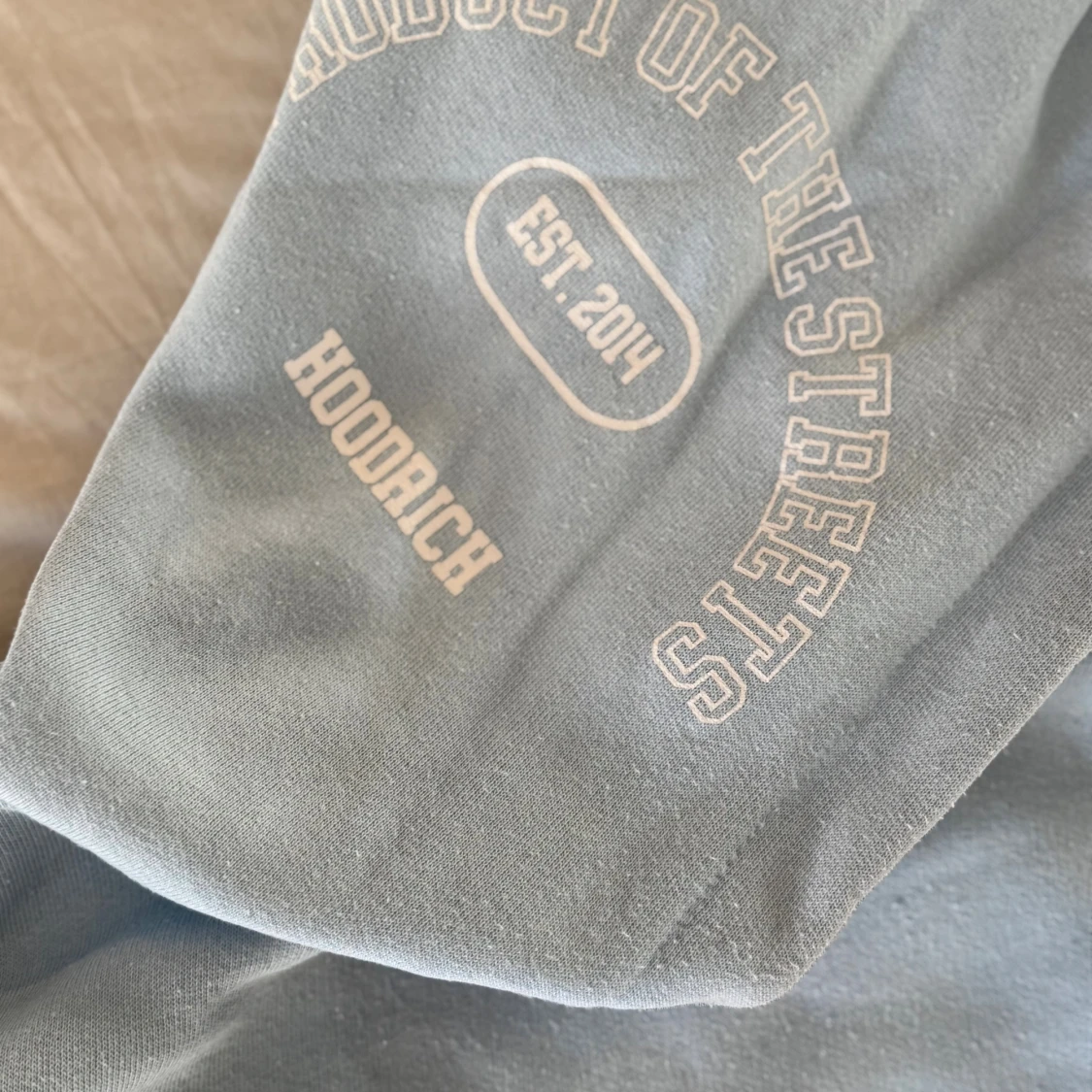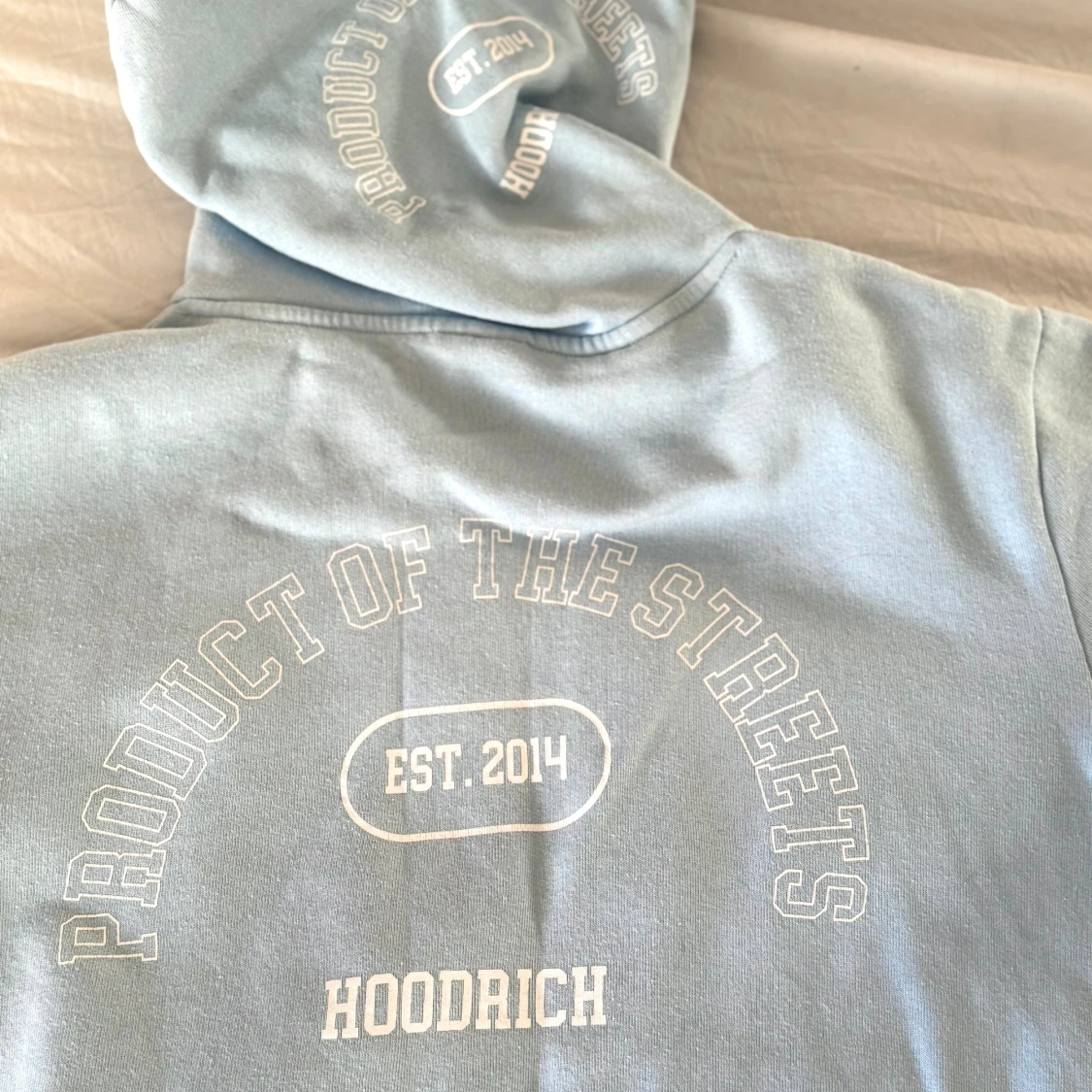 Säljer en ljusblå hoodie från Hoodrich med stor vit logga på bröstet, tryck på ryggen och huvan. Tröjan har huva, magficka och ribbade muddar. Materialet är mjuk bomull och passformen är normal. Tröjan är använd men i väldigt fint skick. Tröjan är i storlek M, passar både dam och herr.