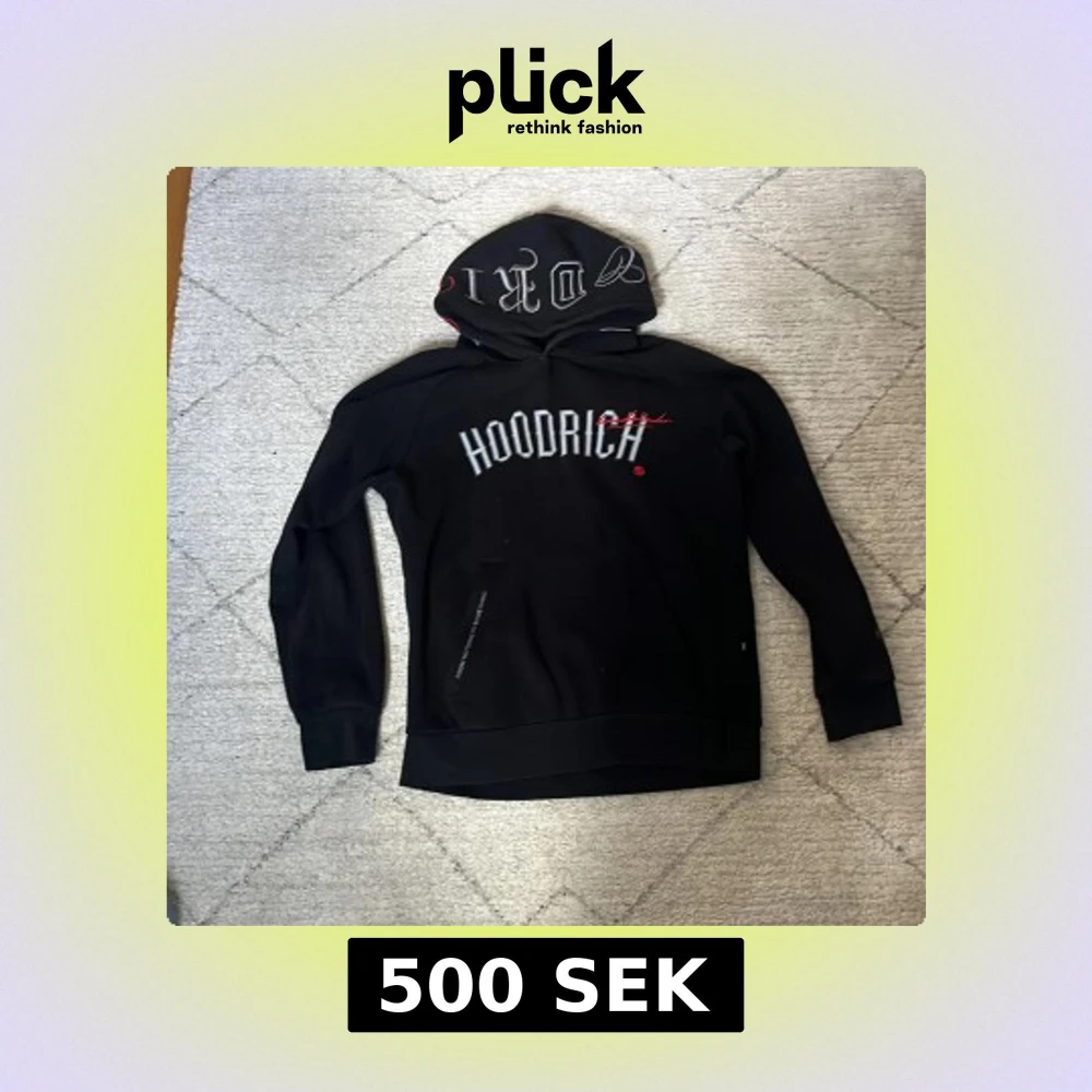 Säljer en svart hoodie från Hoodrich med stora broderade loggor i vitt och rött på bröstet och huvan. Hoodien har långa ärmar och en klassisk passform. Perfekt för dig som gillar streetwear och snygga detaljer.