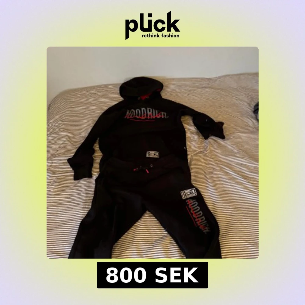 Säljer en svart hoodie från Hoodrich med röd och vit logga på bröstet. Tröjan har en stor ficka framtill och en justerbar huva med dragsko. Perfekt för en avslappnad stil. HOODIEN är M och BYXORNA S.