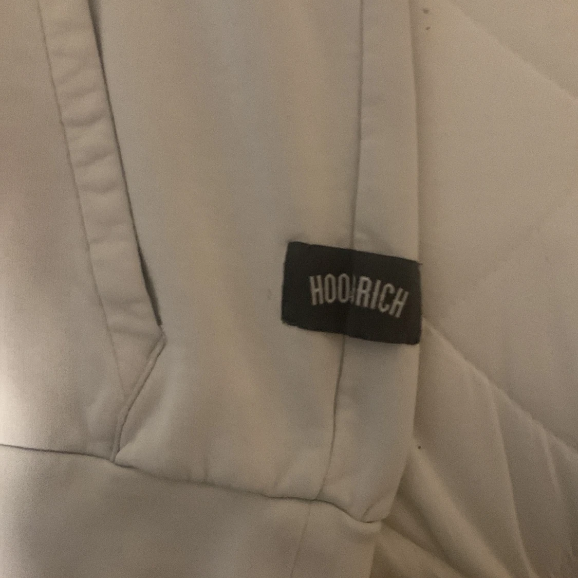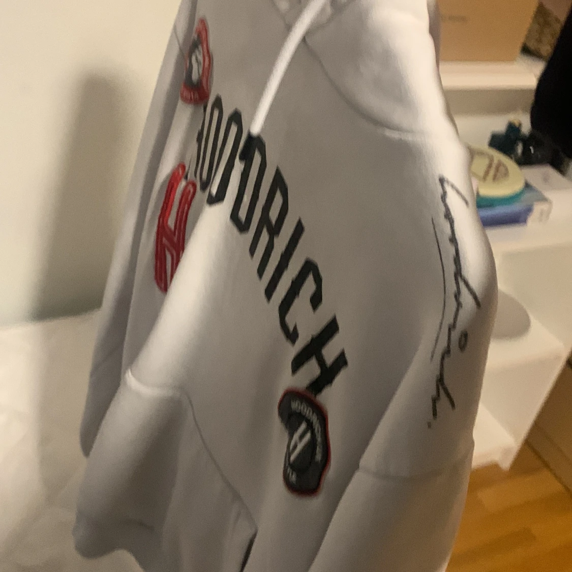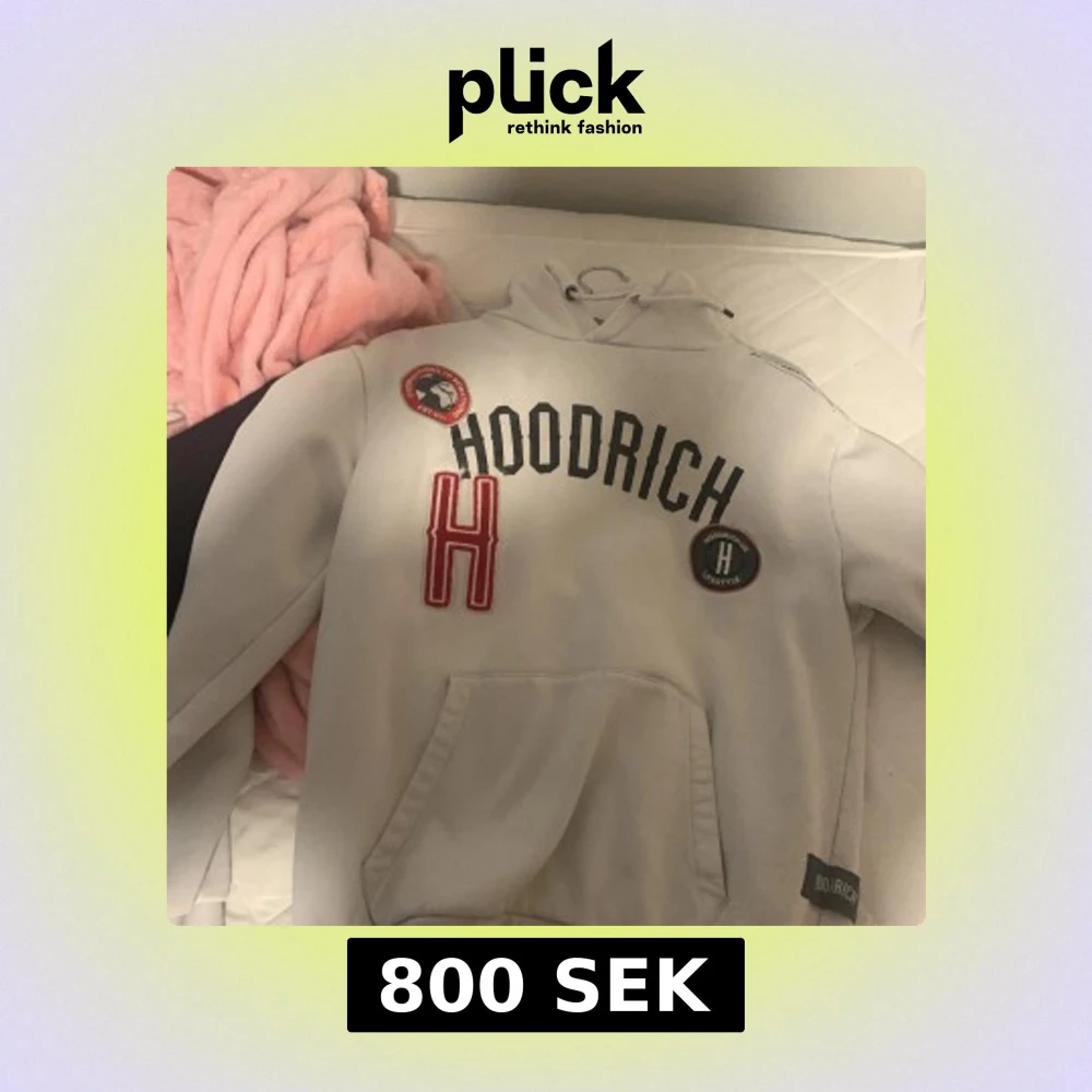 Säljer en vit hoodie från Hoodrich med svart broderad logga, röda och svarta patchar samt stor ficka framtill. Tröjan har huva och långa ärmar, perfekt för en chill och streetig look. Hoodrich-märke på fickan och snygga detaljer på bröstet.