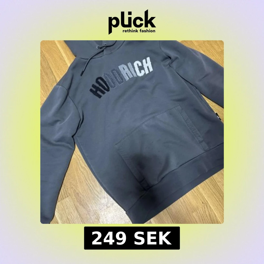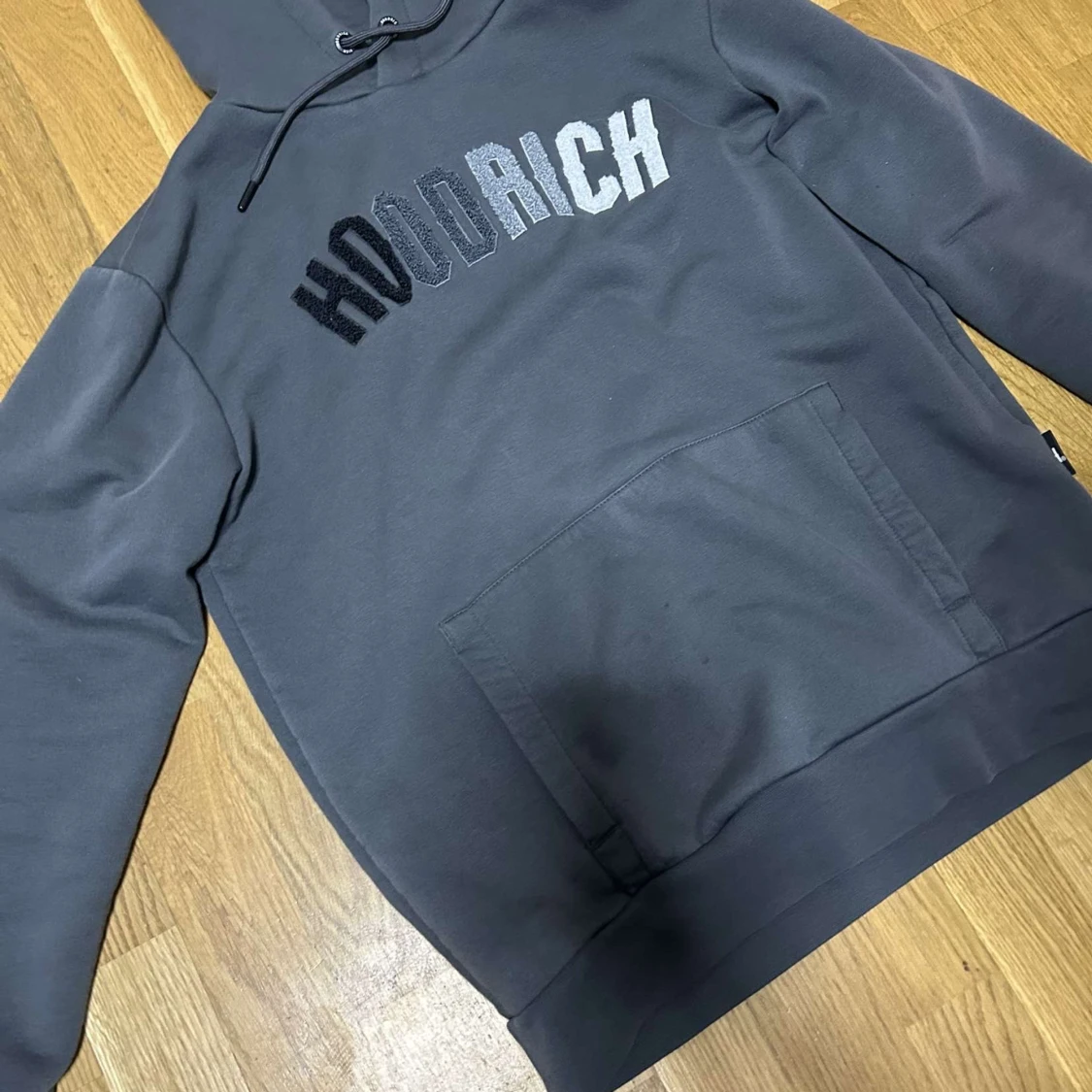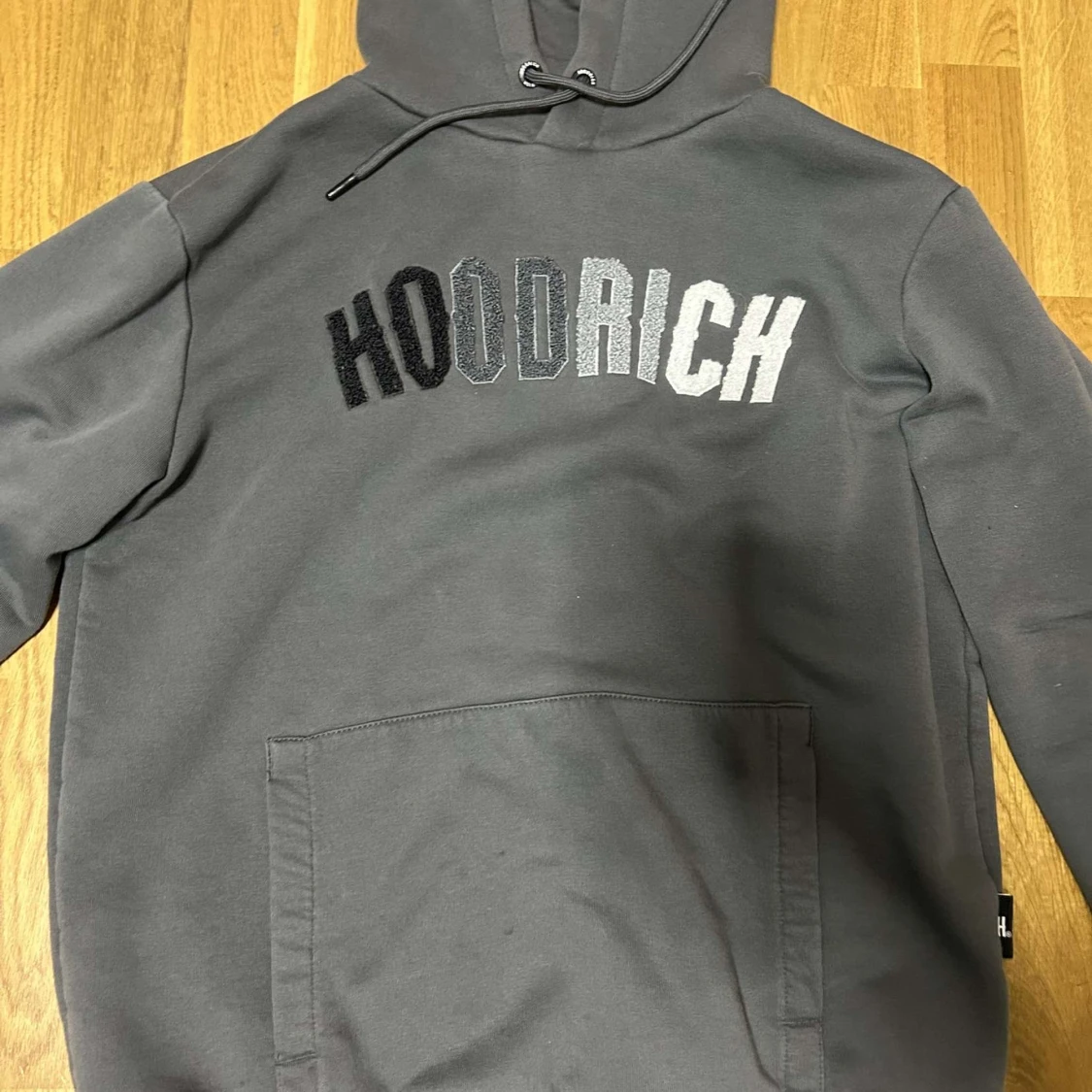 Snygg grå hoodie från HOODRICH med broderad logga i svart, grått och vitt på bröstet. Klassisk känguruficka framtill, huva med dragsko och mjukt material som känns skönt mot huden. Perfekt för en chill och stilren streetlook.