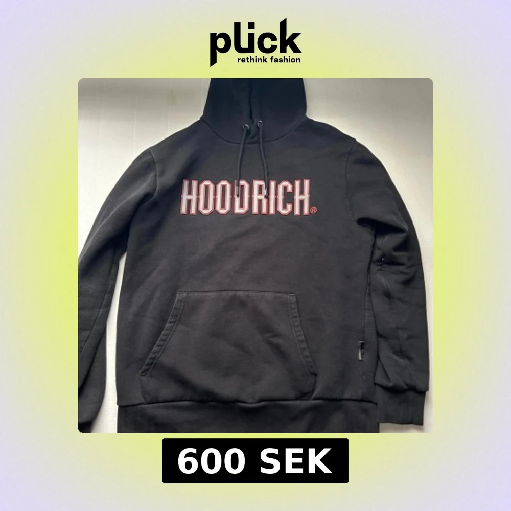 Svart hoodie från HOODRICH med stor vit och röd logga på bröstet. Tröjan har huva med snörning, magficka och långa ärmar. Materialet är mjuk bomull och passformen är normal. Perfekt för dig som gillar streetwear och vill ha en clean look.