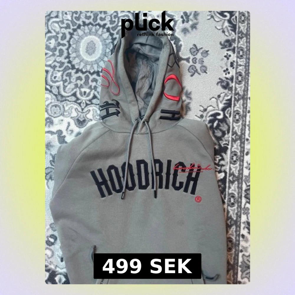 Snygg grå hoodie från Hoodrich i storlek S. Tröjan har svart broderad logga framtill, röda och svarta detaljer på huvan samt snörning. Praktisk ficka med dragkedja och mjukt bomullsmaterial. Perfekt för dig som gillar streetwear och vill sticka ut.