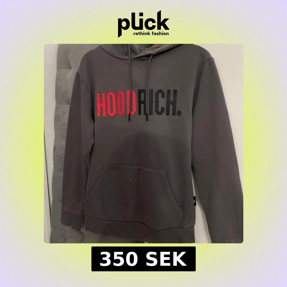 Säljer en grå hoodie från HOODRICH i storlek S. Tröjan har stor logga framtill i rött och svart, huva med snörning.