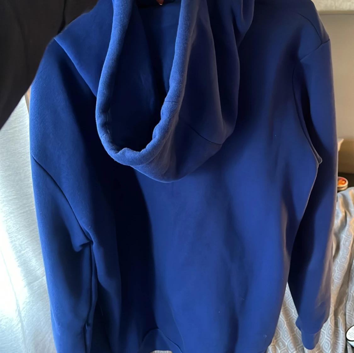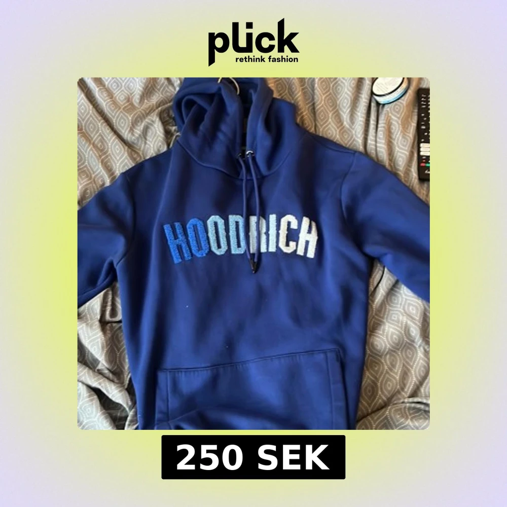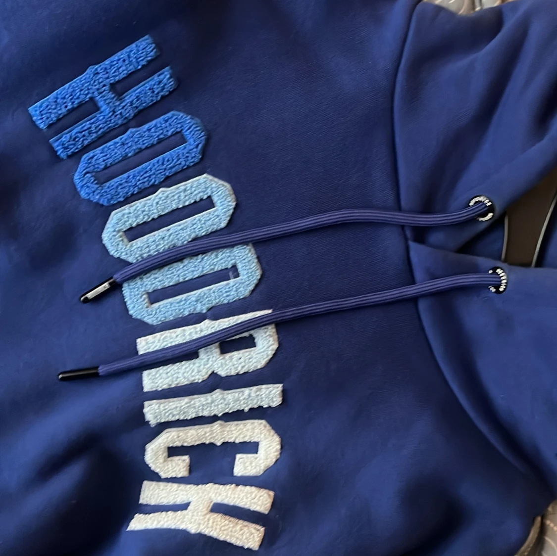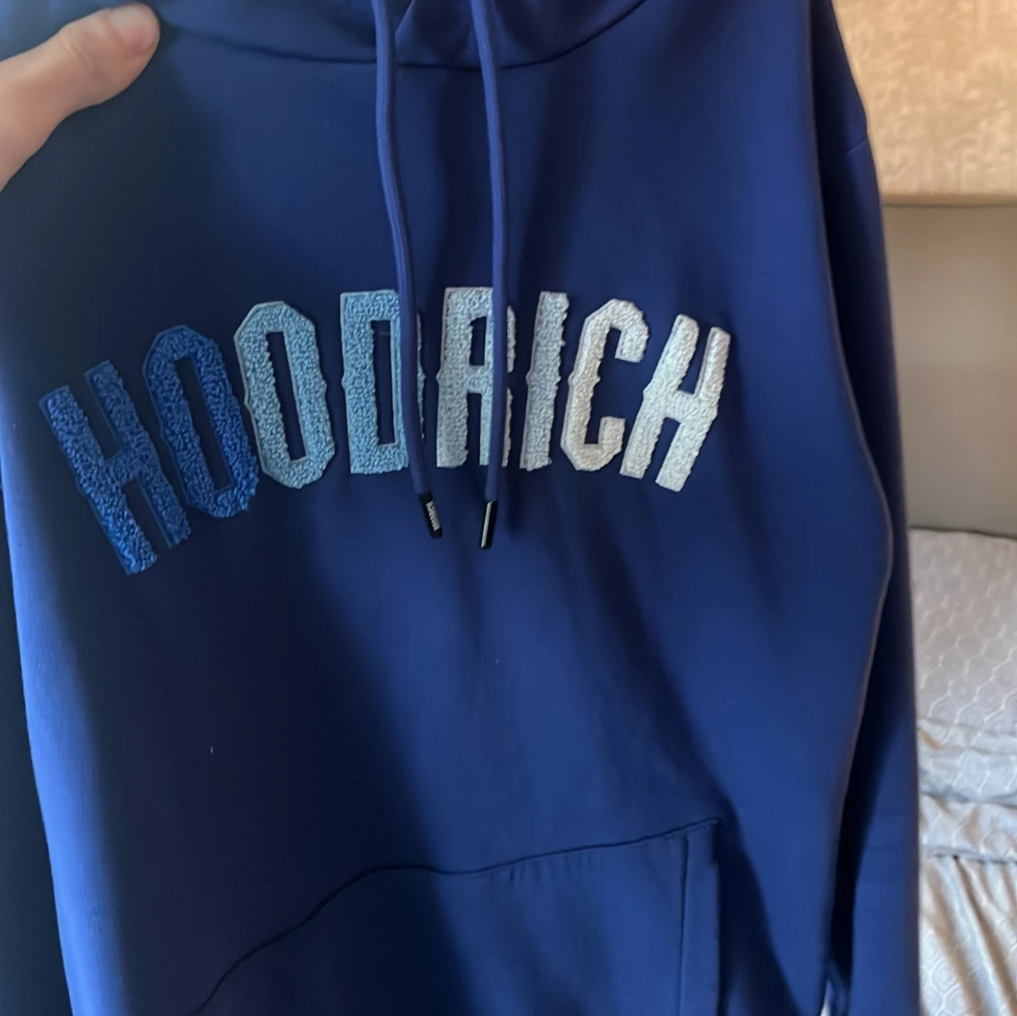 Säljer en blå hoodie från Hoodrich med broderad logga i olika blå och vita nyanser på bröstet. Tröjan har huva med dragsko och en stor magficka. Perfekt för dig som gillar streetwear och vill ha något bekvämt och snyggt.