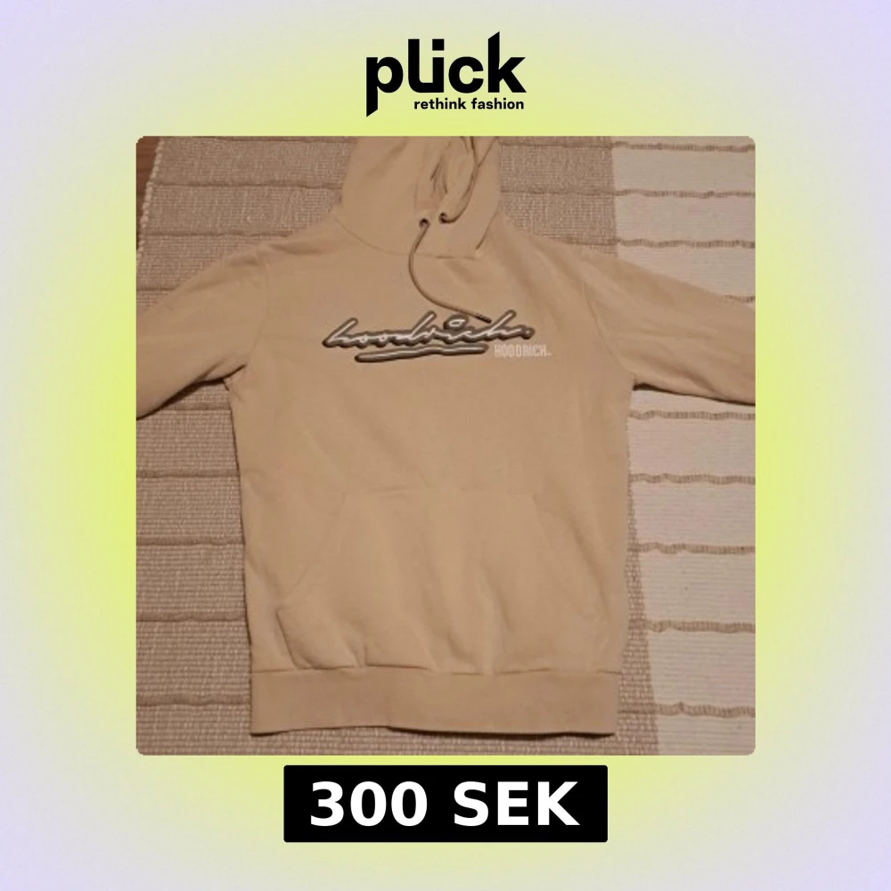 Säljer en beige hoodie från Hoodrich med svart och vit logga broderad på bröstet. Tröjan har huva med dragsko och en stor magficka framtill. Perfekt för en avslappnad stil.