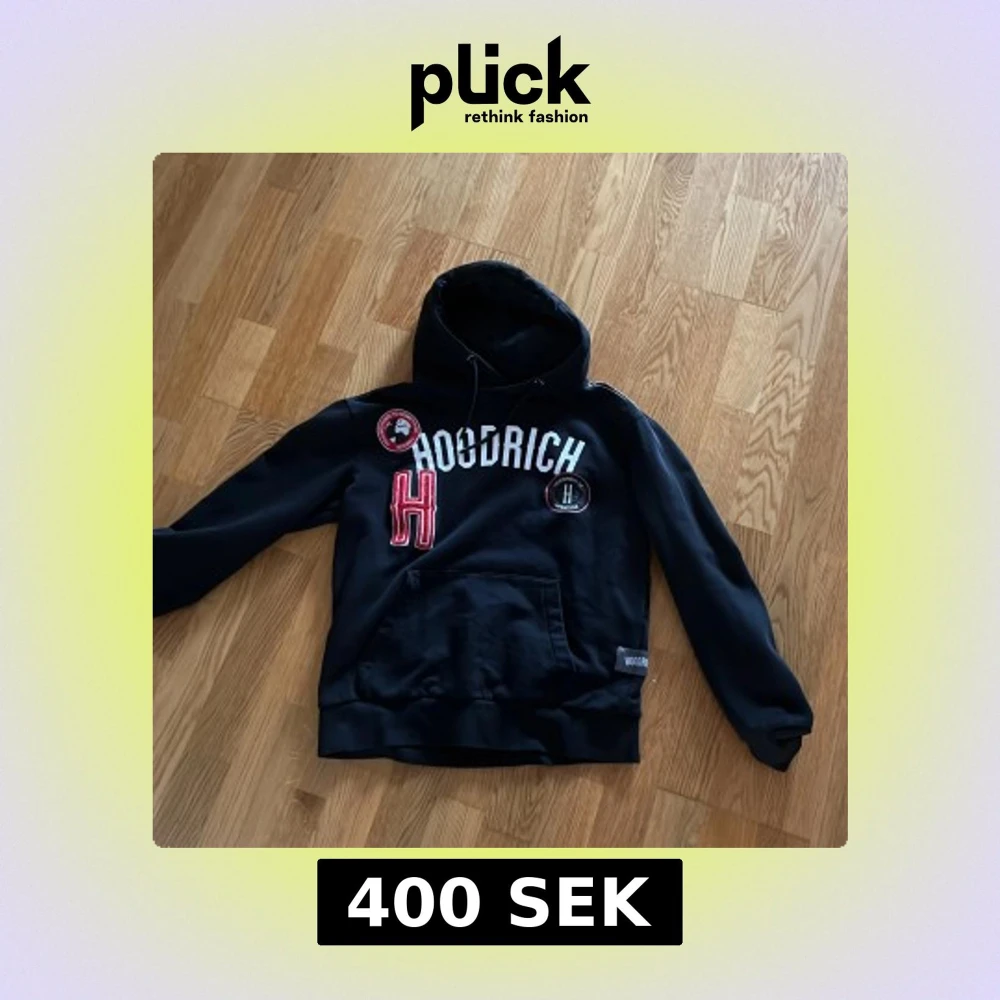 Säljer en svart hoodie från Hoodrich med coola broderade detaljer i rött och vitt. Den har en stor ficka framtill och en justerbar huva med snören. Perfekt för en avslappnad stil. Jag står ej för frakt!!!!! Öppen för prisförslag.