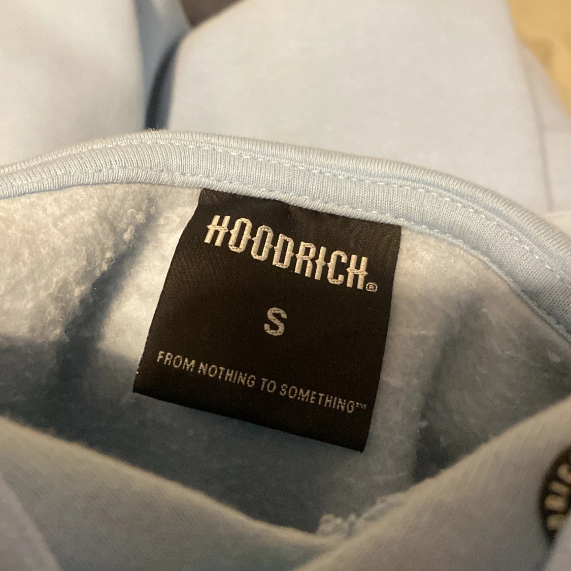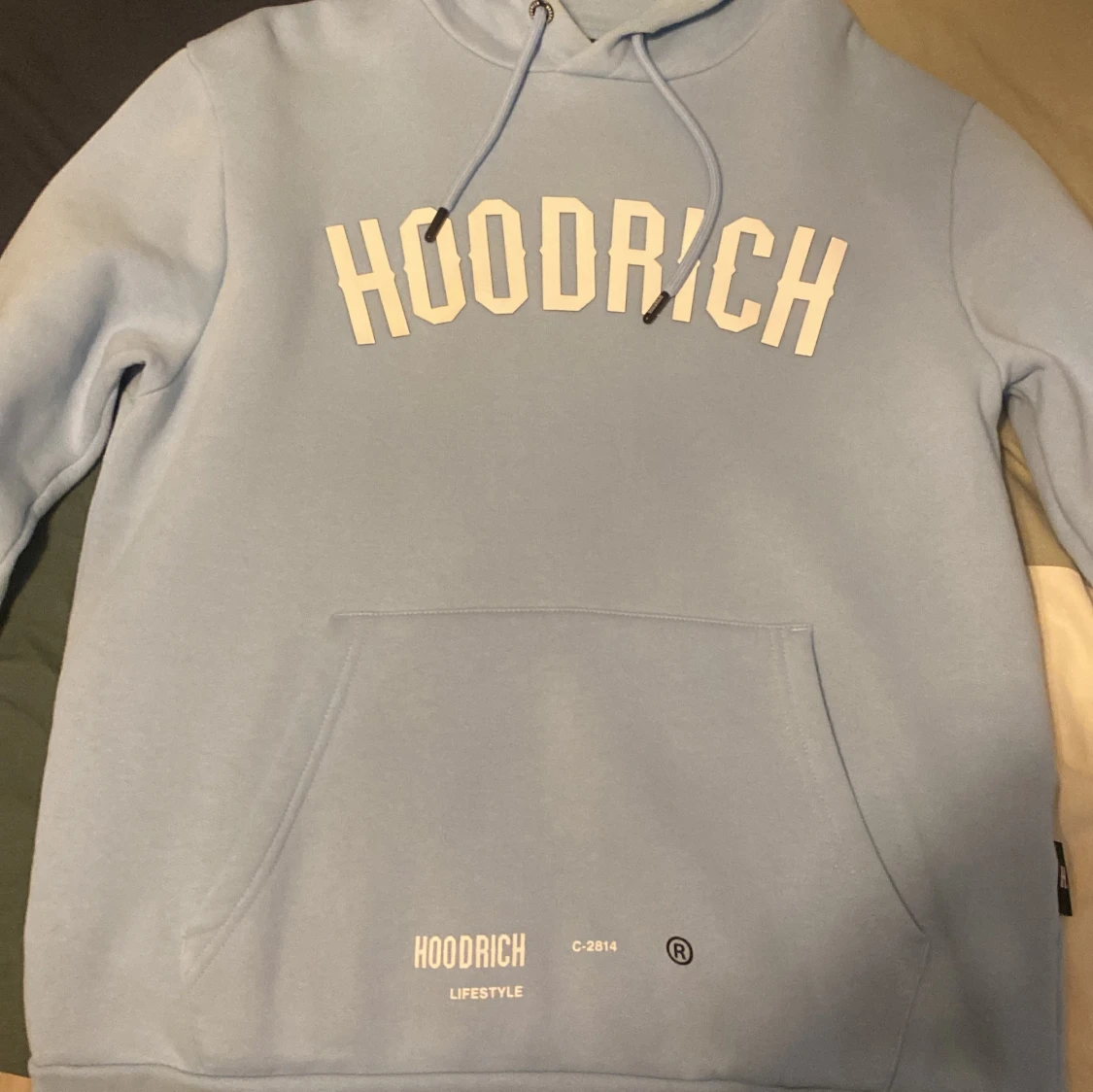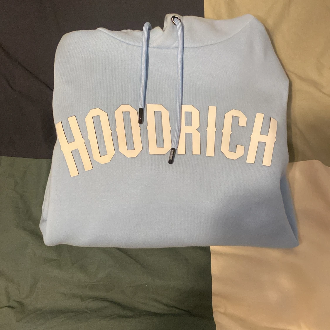 Säljer en ljusblå hoodie från Hoodrich med stor vit logga framtill och text på ryggen. Tröjan har huva med dragsko och en stor magficka. Perfekt för en avslappnad streetwear-look.