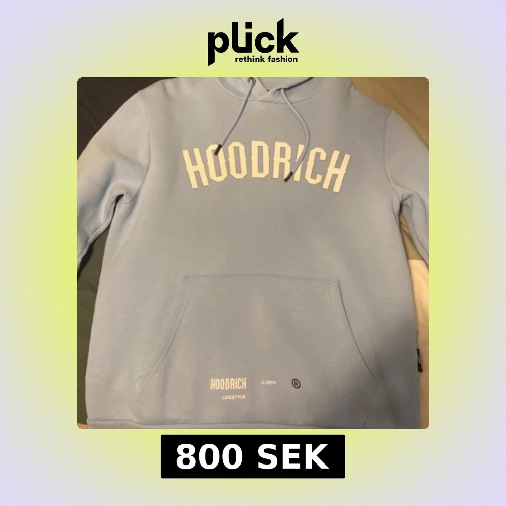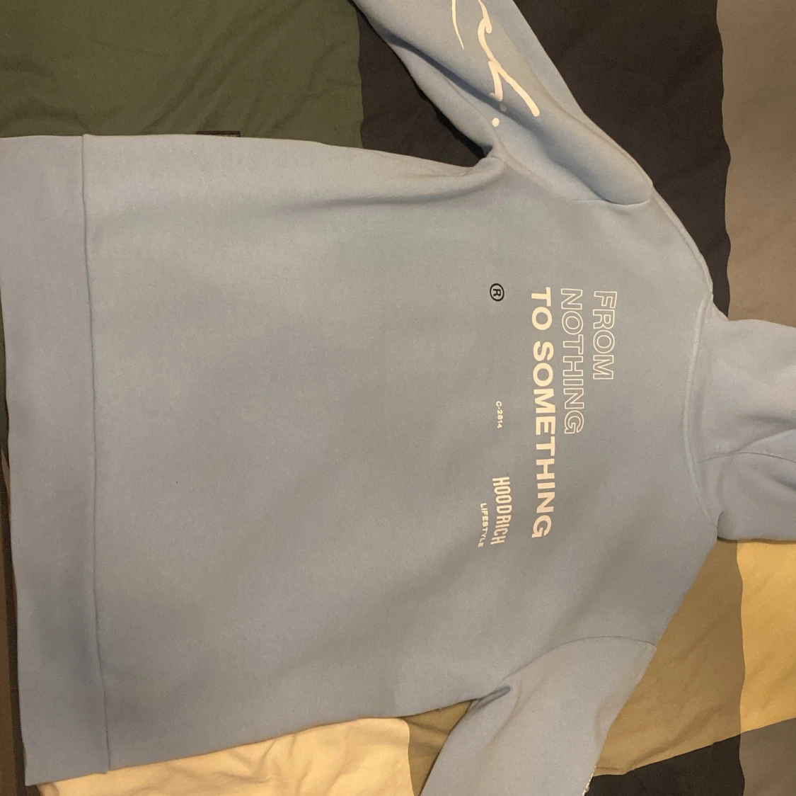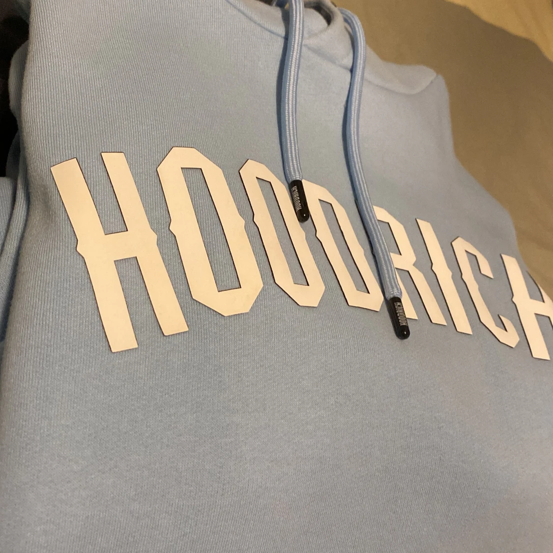 Säljer en ljusblå hoodie från Hoodrich med stor vit logga framtill och text på ryggen. Tröjan har huva med dragsko och en stor magficka. Perfekt för en avslappnad streetwear-look.