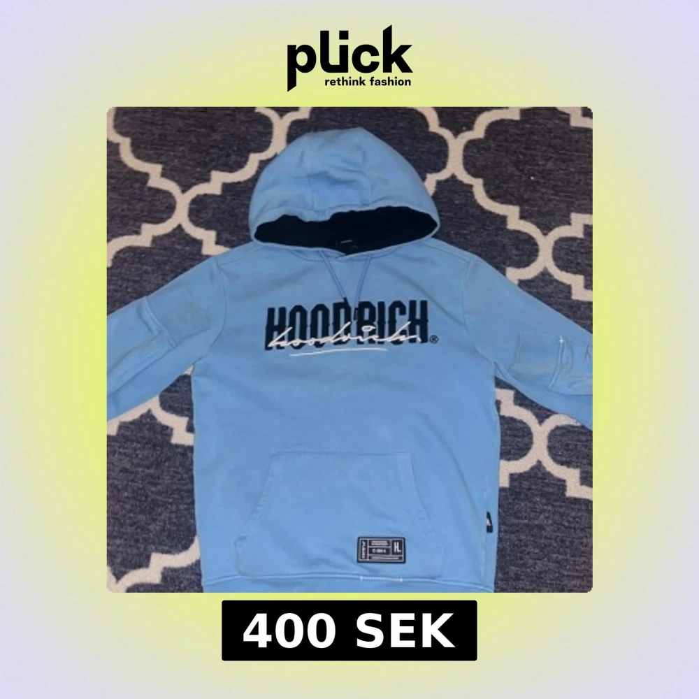 Snygg ljusblå hoodie från Hoodrich med stort svart och vitt tryck på bröstet. Tröjan har huva med snörning, känguruficka och ribbade muddar. Perfekt för dig som gillar streetwear och vill sticka ut med en cool look.