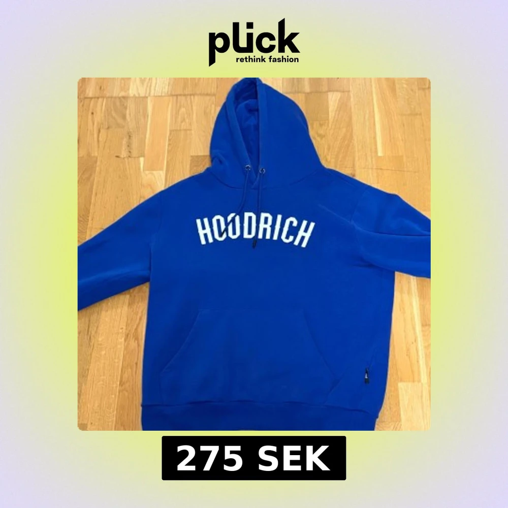 Säljer en blå hoodie från Hoodrich med vit logga framtill och tryck på ryggen. Tröjan har huva med dragsko och en stor magficka. Perfekt för dig som gillar streetwear och vill ha en snygg och bekväm tröja storlek L. Och byxor som är likadana som hoodien. Storlek på byxorna Xl passar även L