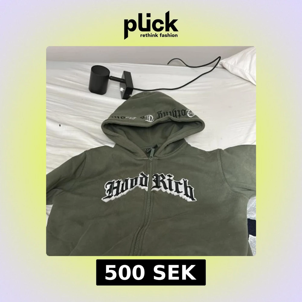 Olivgrön hoodie från Hoodrich med broderad logga i svart och vitt framtill och tryck på ryggen. Tröjan har dragkedja, huva och är tillverkad i mjukt material. Perfekt för en chill streetwear-look.