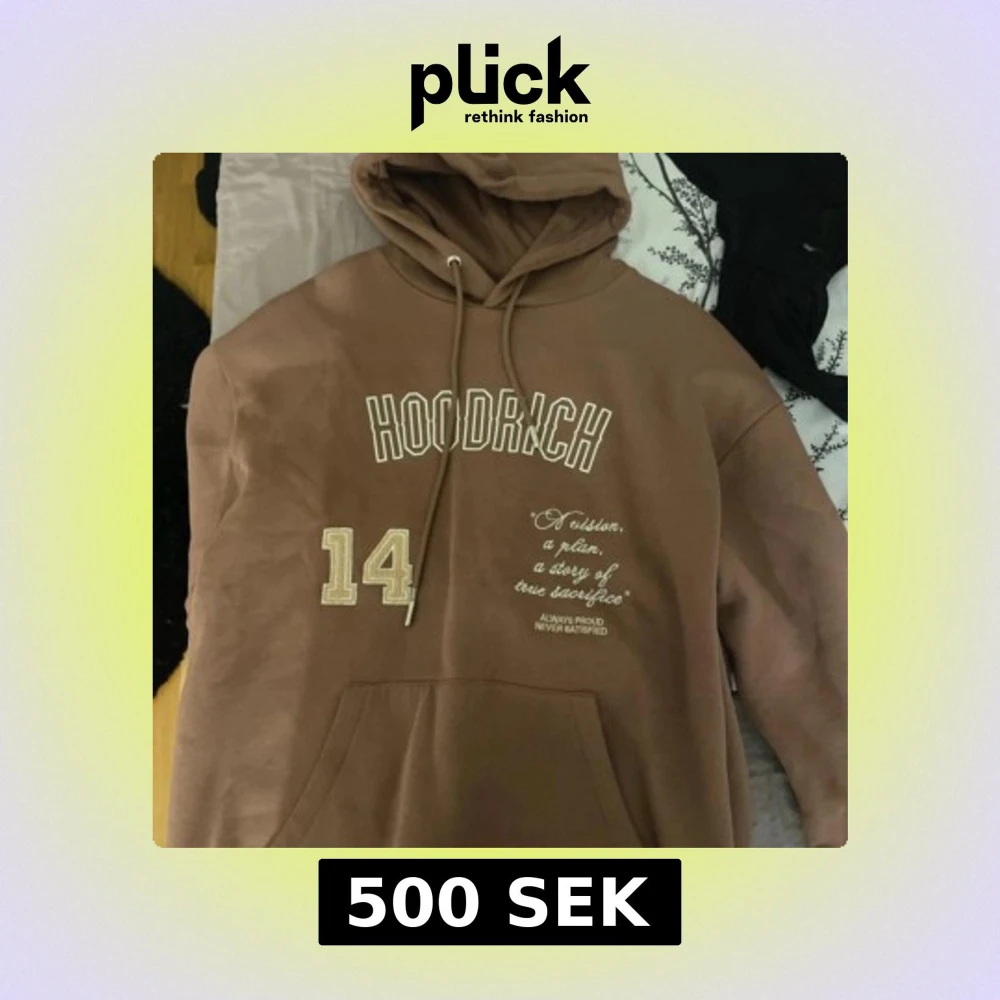 Säljer en brun hoodie från Hoodrich med tryck framtill. Den har en känguruficka och justerbar huva med snören. Perfekt för en avslappnad stil. Storlek XS, jag är en storlek S/M och den passa och är lite stor. Eftersom den är köpt från London är det deras storlek.