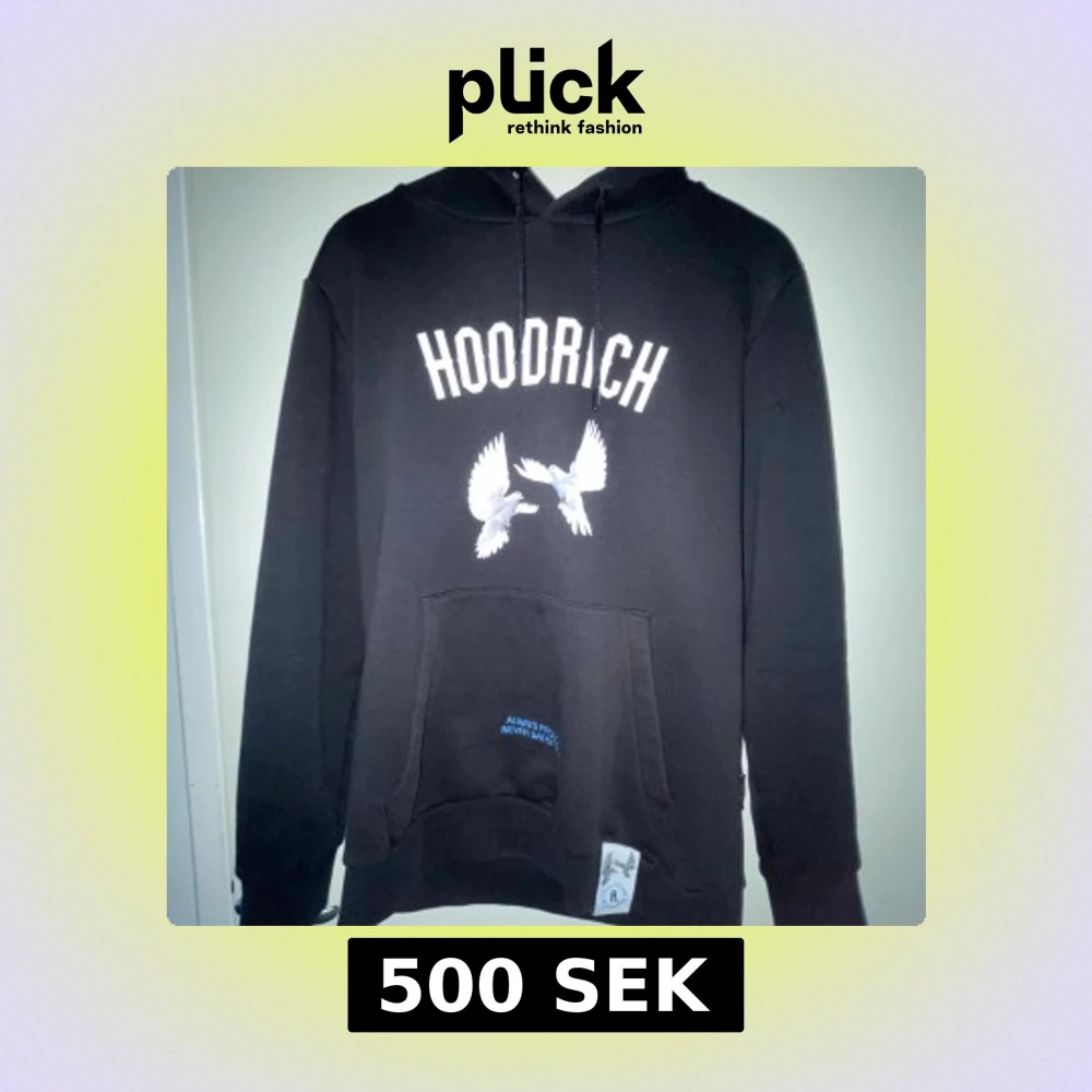 Svart hoodie från Hoodrich i storlek XS med tryck av vita duvor och texten 'From Nothing To Something' på ryggen. Klassisk känguruficka framtill, snörning i huvan och coola detaljer. Perfekt för dig som gillar streetwear vibes. Priset kan diskuteras.