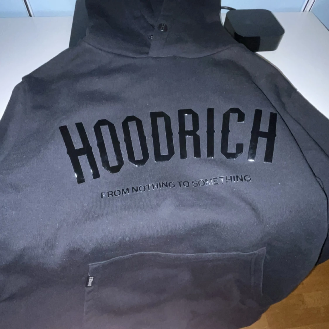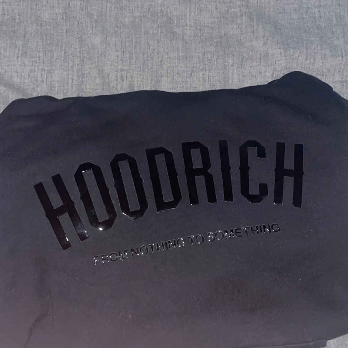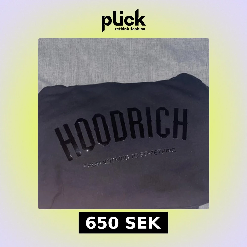 Säljer en svart hoodie från Hoodrich med texten 'From Nothing to Something' tryckt på framsidan. Den har en klassisk känguruficka och en bekväm huva. Perfekt för en avslappnad stil. Köpt på JdSports i Berlin för 75 euro~850kr, använd 2 ggr och är i nyskick, modellen är 175 cm och väger 68 kg så den passar mycket bra till storlek S också!!