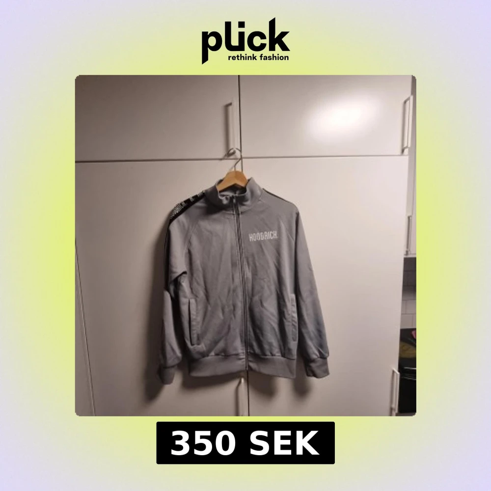 Säljer en grå track jacket från Hoodrich med vit logga på bröstet och svarta detaljer med text längs axlarna. Jackan har hel dragkedja, ståkrage och ribbade muddar. Perfekt för en sportig och clean streetstyle-look. Lite knottrig på ryggen se bild 3.
