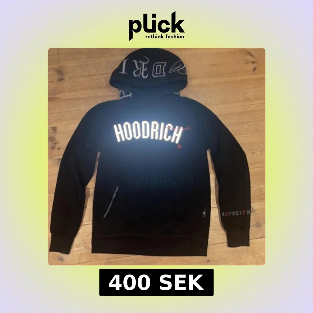 Svart hoodie från Hoodrich med stor vit logga på bröstet och detaljer i rött. Huvan har broderade mönster och tryck i vitt och rött. Klassisk känguruficka framtill och ribbade muddar vid ärmslut och nederkant. Kan gå ner i pris lite vid en snabb och smidig affär🤗