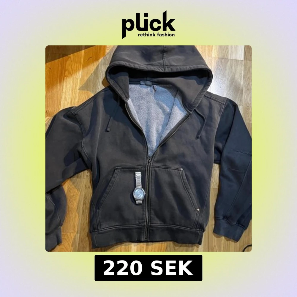 Säljer en svart hoodie med dragkedja och huva. Insidan är fodrad med mjuk fleece för extra komfort. Tröjan har stora fickor framtill och snörning i huvan. Perfekt för kyliga dagar och en avslappnad stil.