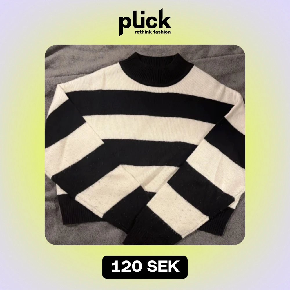 Säljer en supermysig svart och vit randig stickad tröja. Den har en hög krage och långa ärmar, perfekt för kyliga dagar. Tröjan är i nyskick och har en skön passform som är lite loose och cropped. Perfekt för både höst och vinter! 🖤🤍