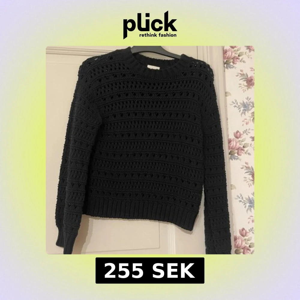 Svart stickad tröja från H&M med hålmönster och ribbade muddar vid hals, ärmslut och nederkant. Tröjan har lång ärm och en lite loose passform.