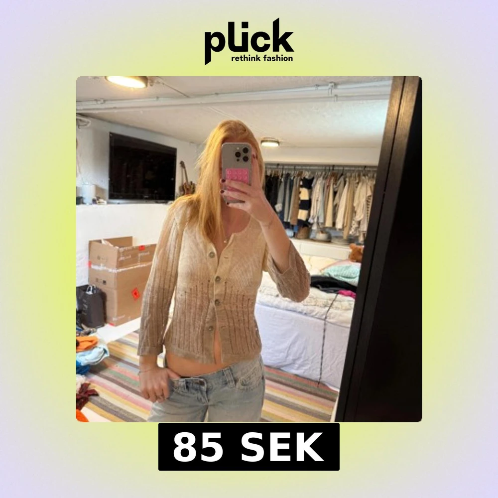Säljer en tunn, stickad kofta i beige med snygga genombrutna detaljer och knappar framtill. Koftan har en croppad passform och trekvartsärmar, perfekt för lager-på-lager och chill vårstil.
