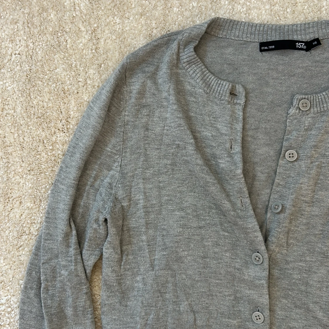 Grå kofta från 157 i storlek XS. Enkel och stilren design med rund halsringning, långa ärmar och knäppning framtill med matchande knappar. Tillverkad i mjukt material som passar perfekt för lager-på-lager under kyligare dagar.