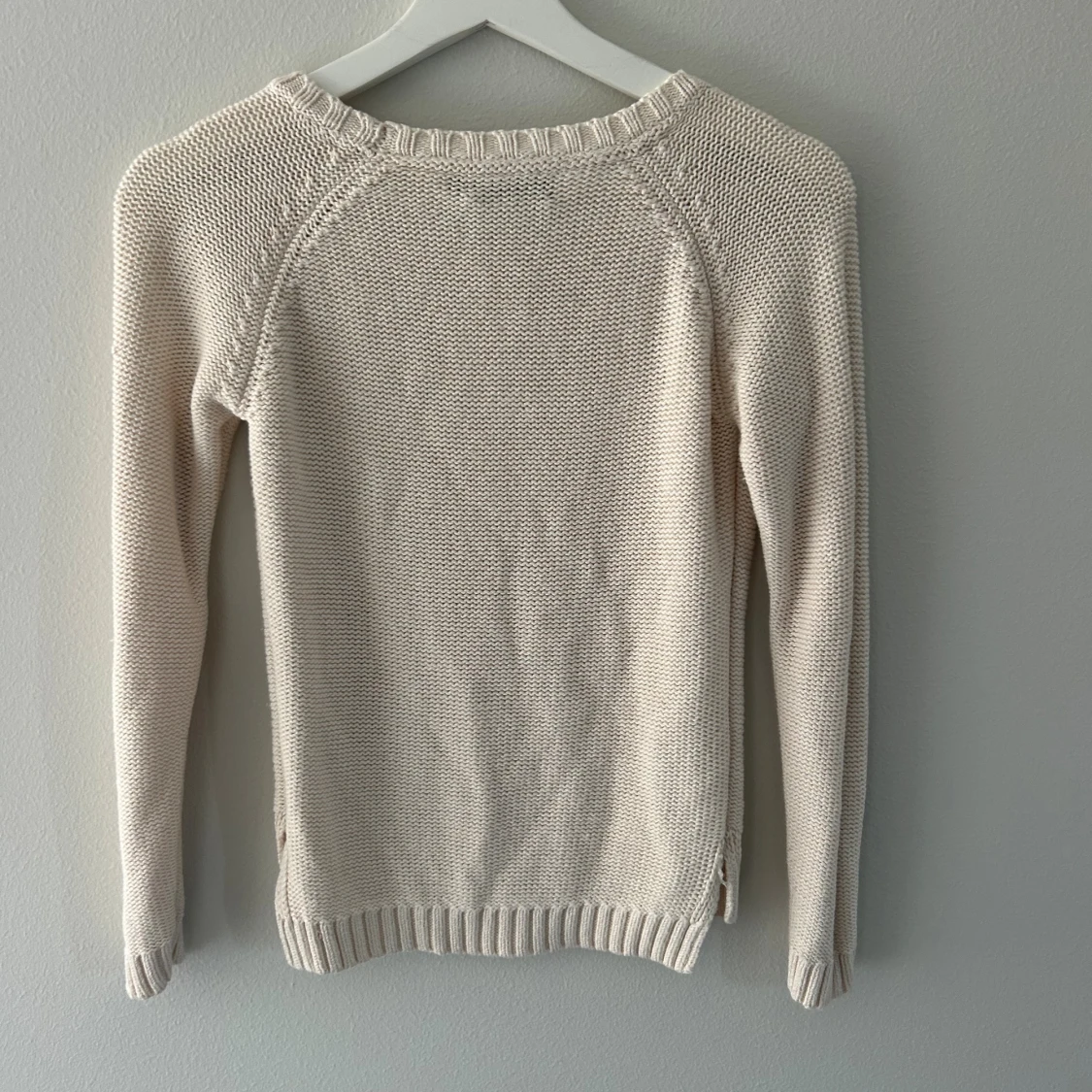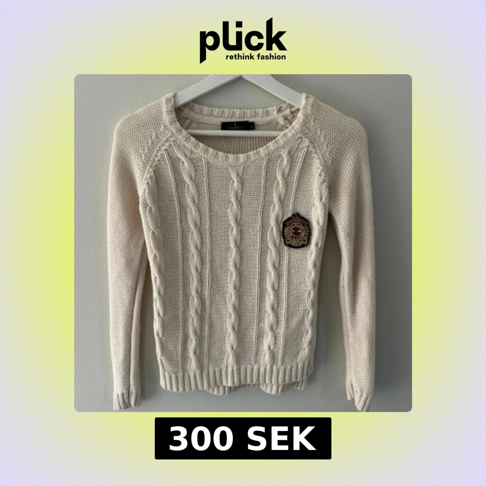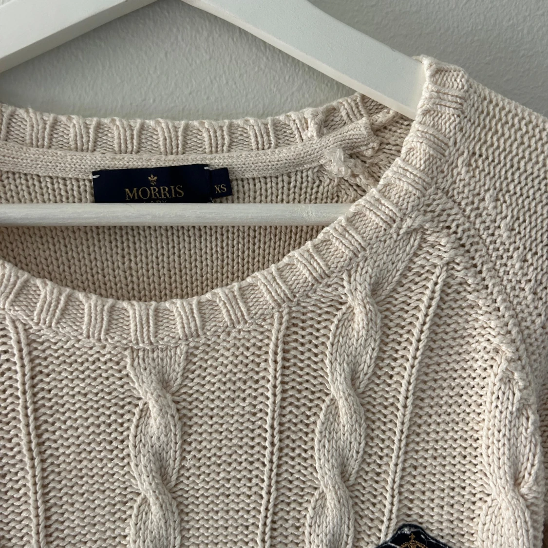 Kabelstickad beige tröja från Morris med rund halsringning och ett broderat emblem på bröstet. Bra skick och storlek xs.