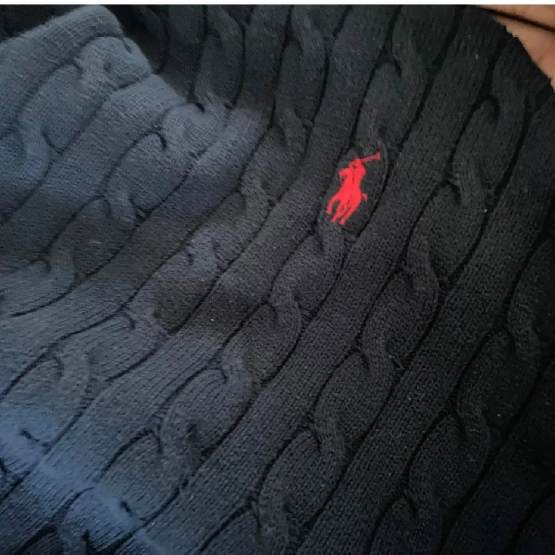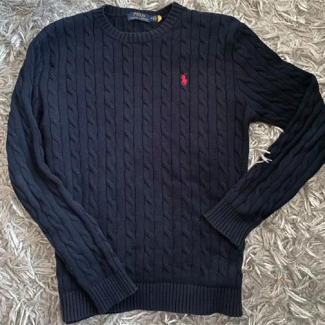 Säljer en snygg mörkblå stickad tröja från Ralph Lauren med det klassiska röda logotypbroderiet på bröstet. Tröjan har en kabelstickad design och långa ärmar med ribbade muddar. Perfekt för både höst och vinter!