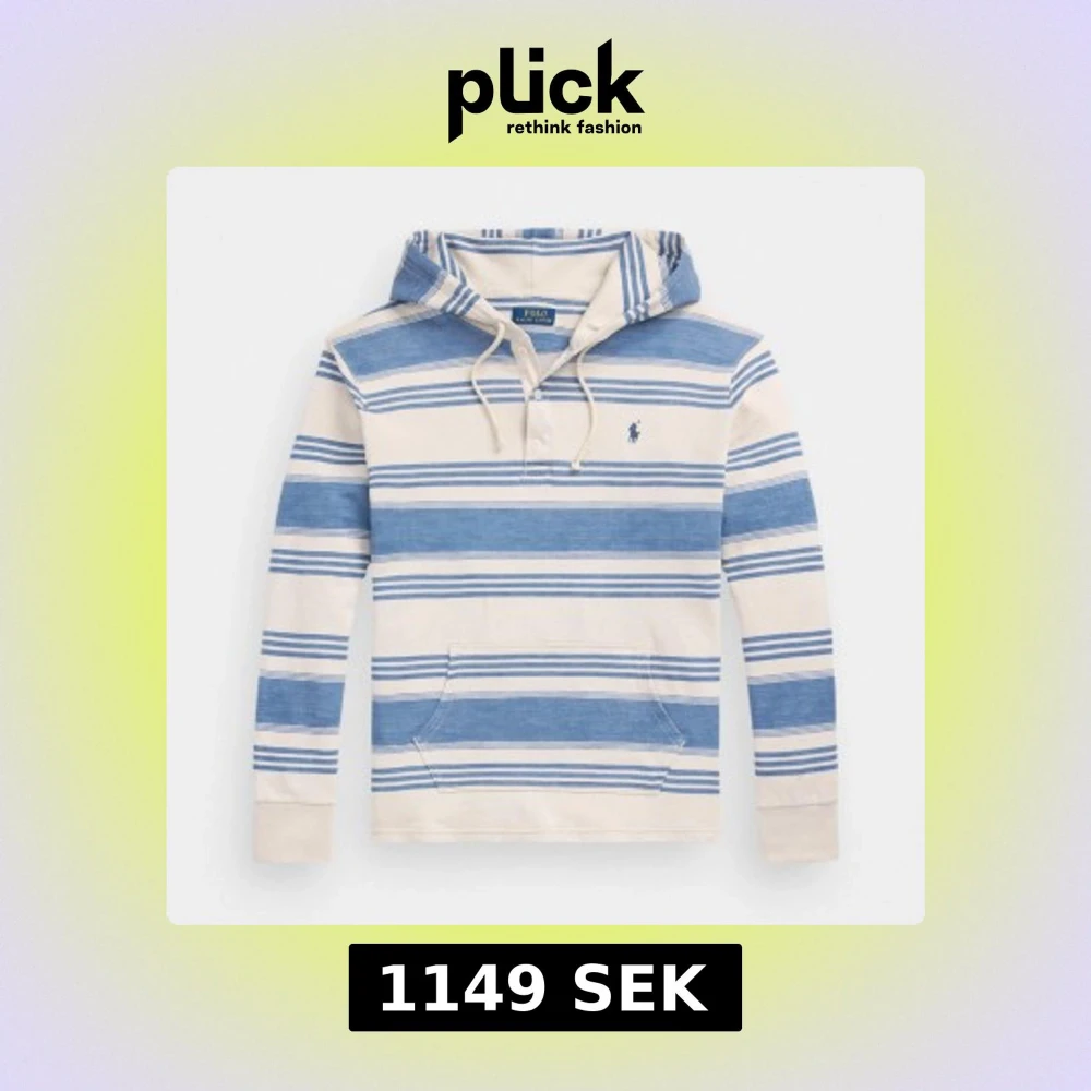 Snygg hoodie från Polo Ralph Lauren i vitt och blått med breda ränder. Tröjan har huva med snörning, knappar vid halsen och en stor magficka. Tillverkad i mjuk bomull och perfekt för en avslappnad stil. Strl M, nästan helt oanvänd. Nypris 1500