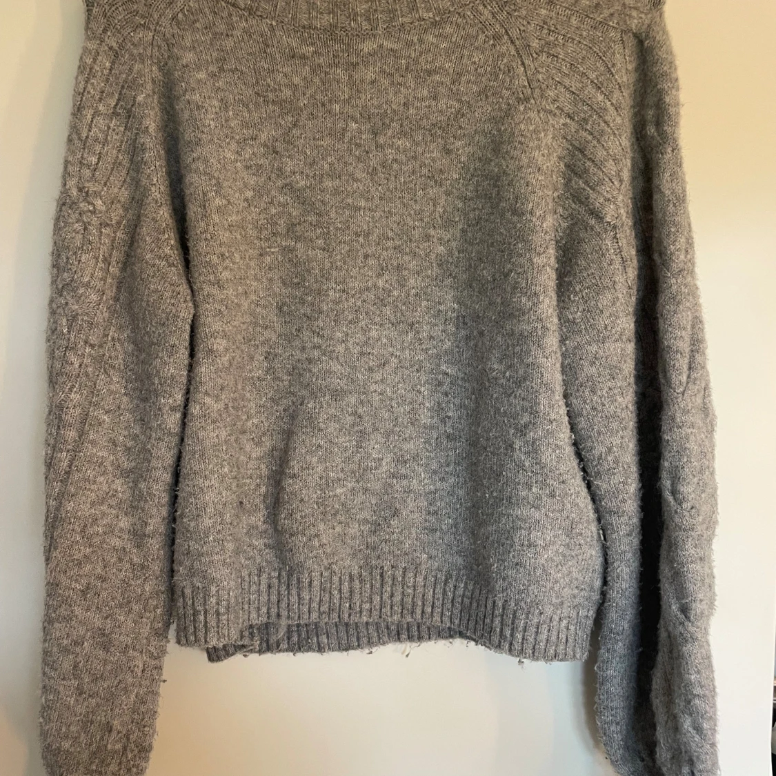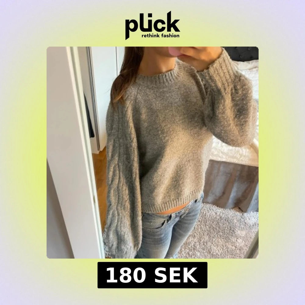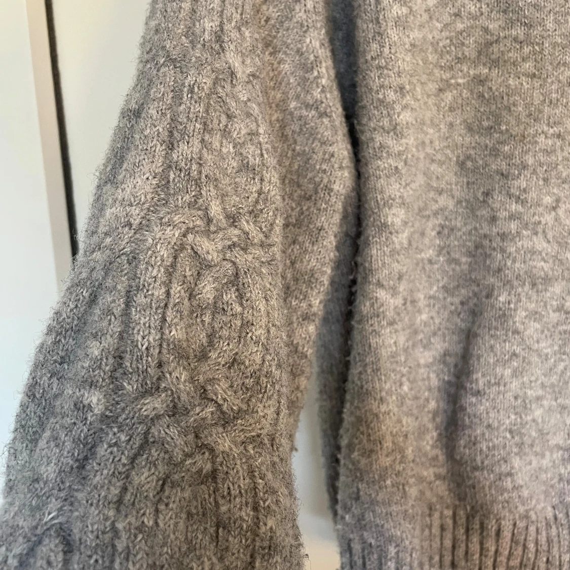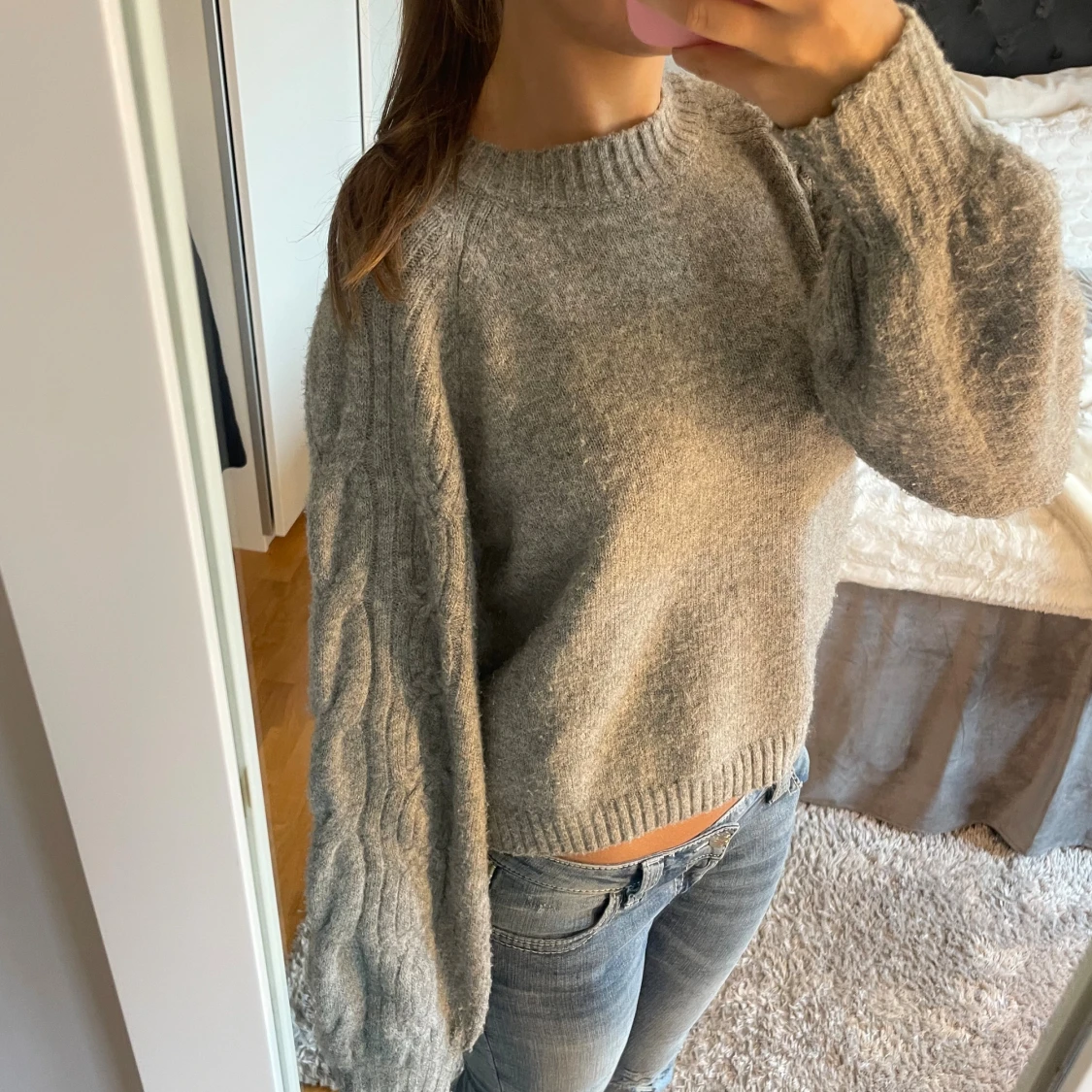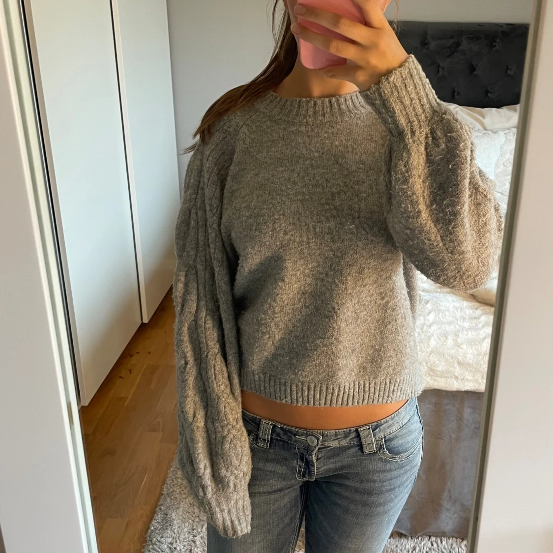 Mysig grå stickad tröja med rund hals och långa ärmar. Armarna har ett snyggt kabelstickat mönster som ger extra stil. Tröjan har ribbade muddar vid hals, ärmslut och nederkant. Perfekt för dig som gillar chill och enkel vibe. Är lite nopprig så därav de billiga priset