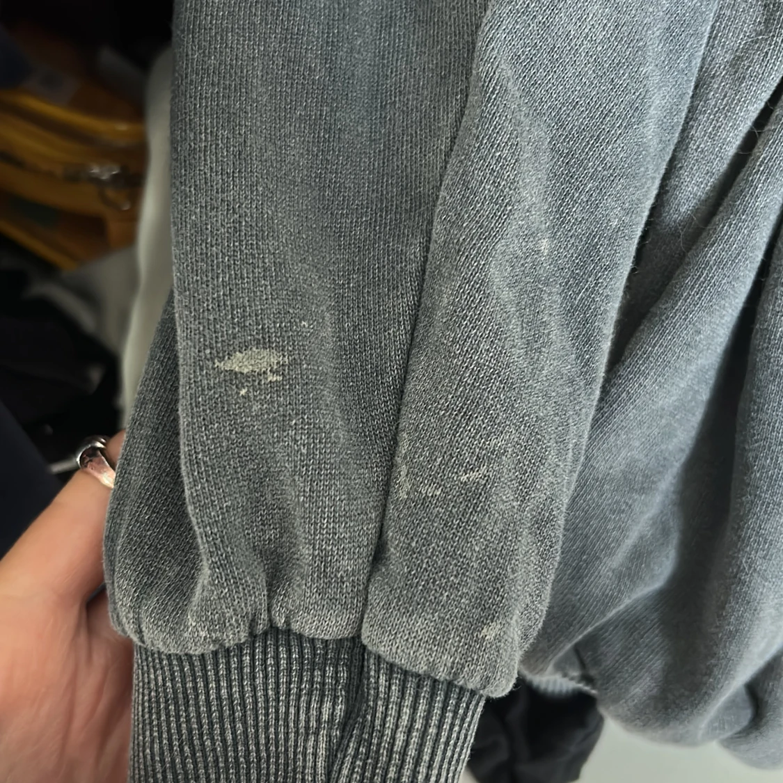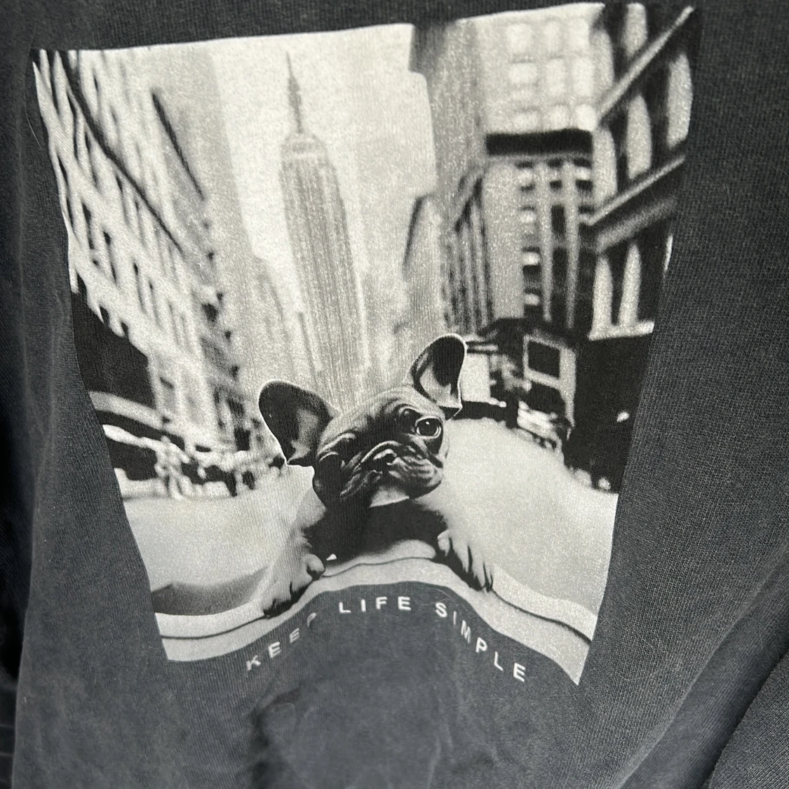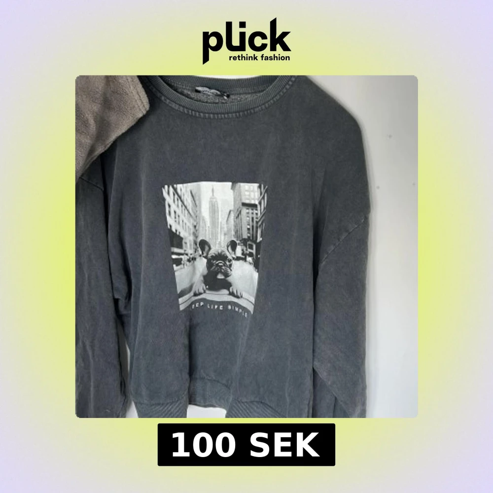 Cool mörkgrå sweatshirt från Stradivarius med ett svartvitt tryck av en fransk bulldog och texten 'Keep Life Simple' på bröstet. Tröjan har rund hals, långa ärmar och ribbade muddar. Perfekt för en chill och avslappnad stil. Har en liten fläck och knappt använd