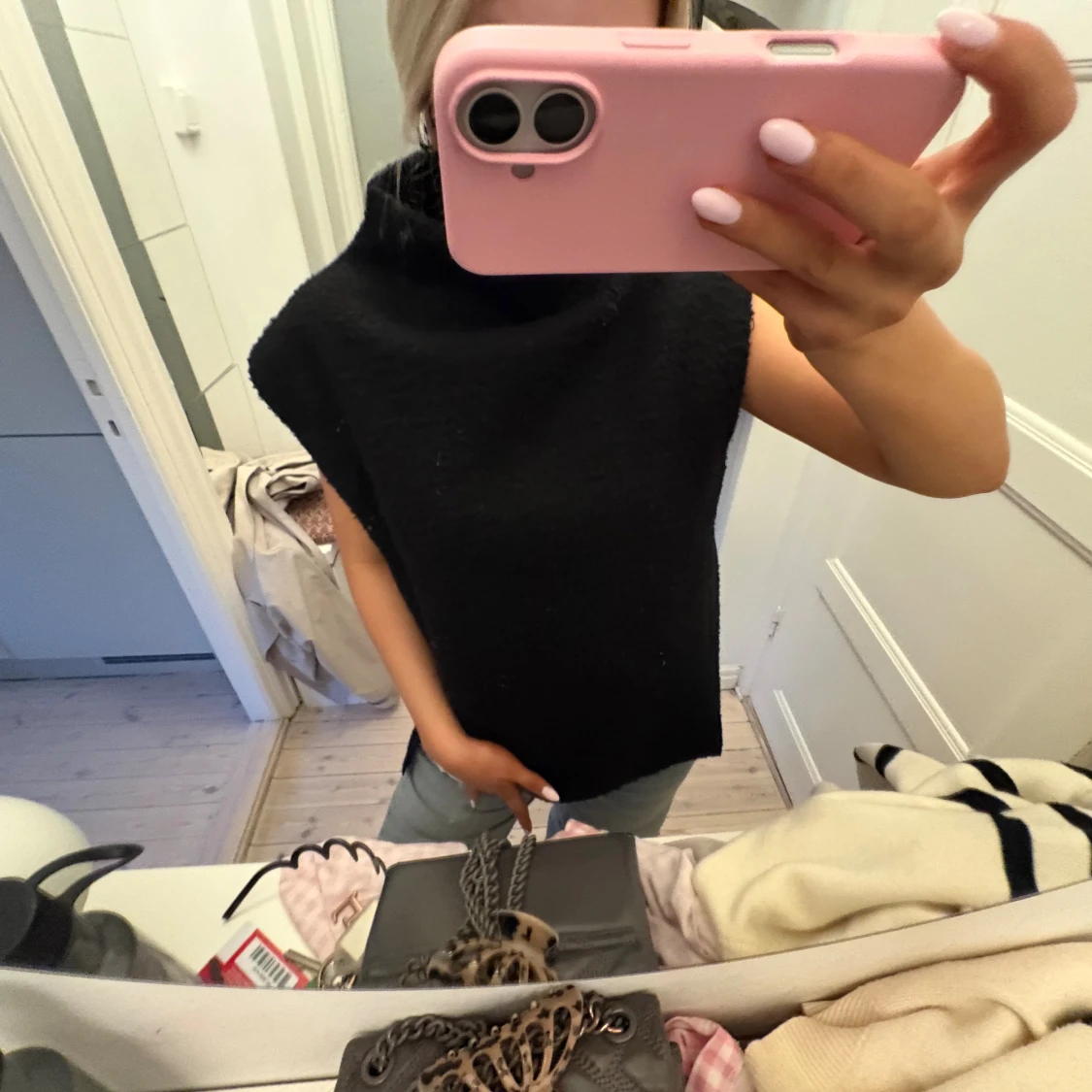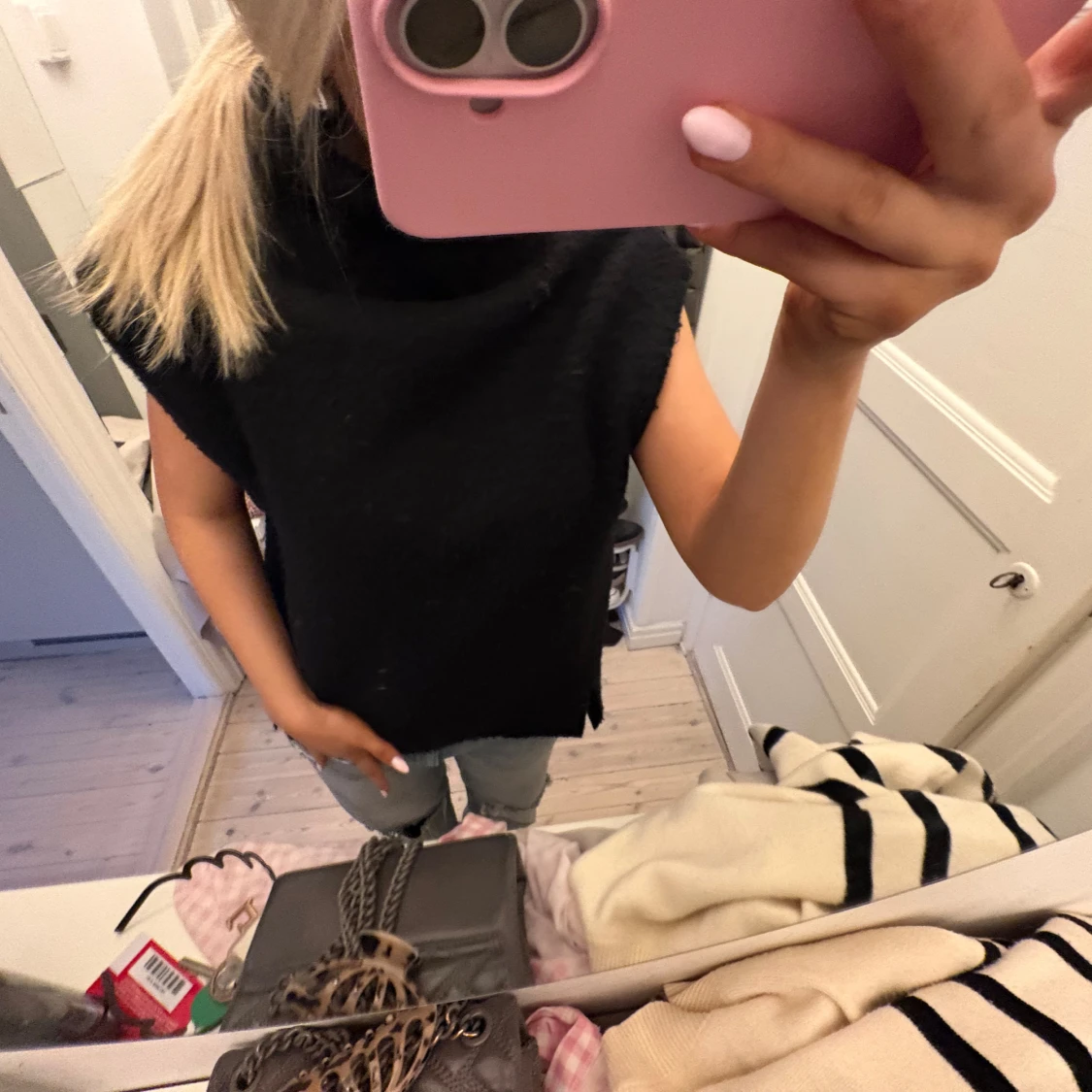 Svart, ärmlös väst med en låg krage. Västen ger en enkel och clean look och är perfekt för en chill vibe nu på hösten. Skriv vid frågor 💕