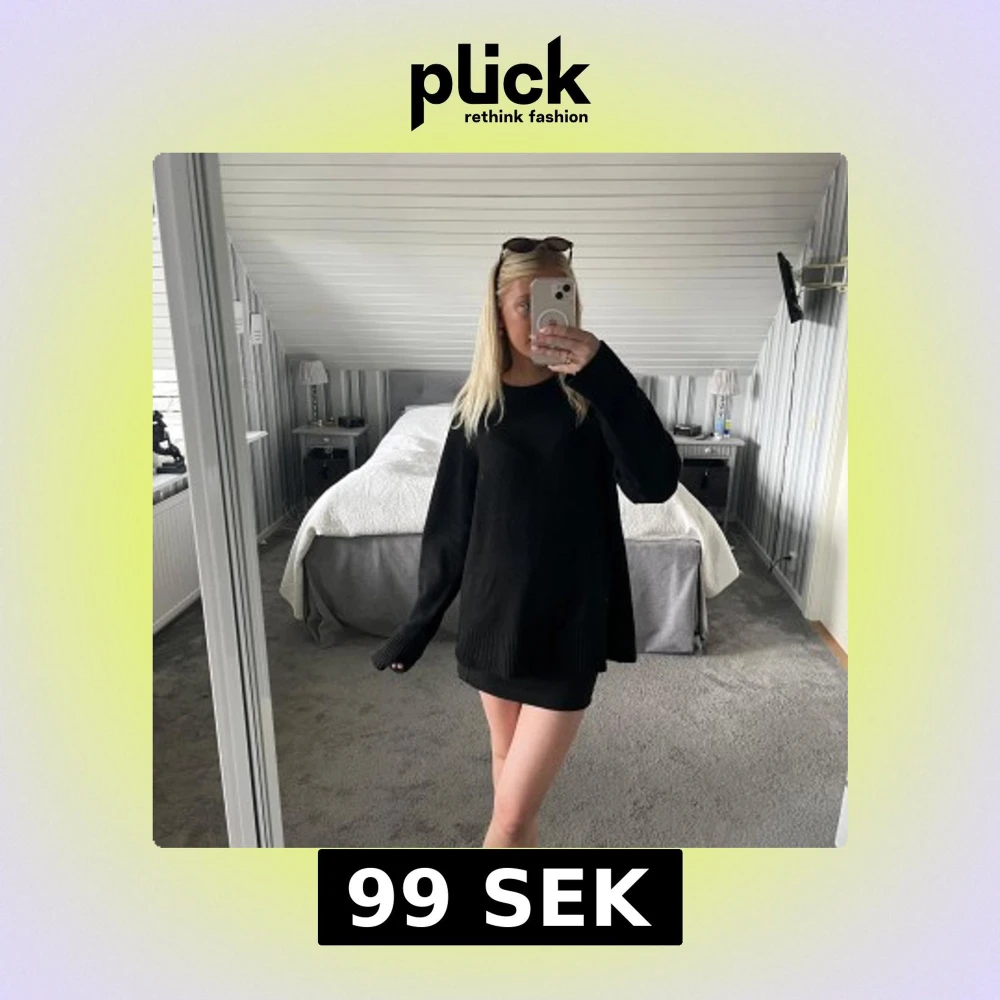 Säljer en svart oversized stickad tröja med rund hals och långa ärmar. Tröjan har breda ribbade muddar vid ärmslut och nederkant, vilket ger en chill och avslappnad vibe. Perfekt att slänga på sig över en kjol eller jeans.