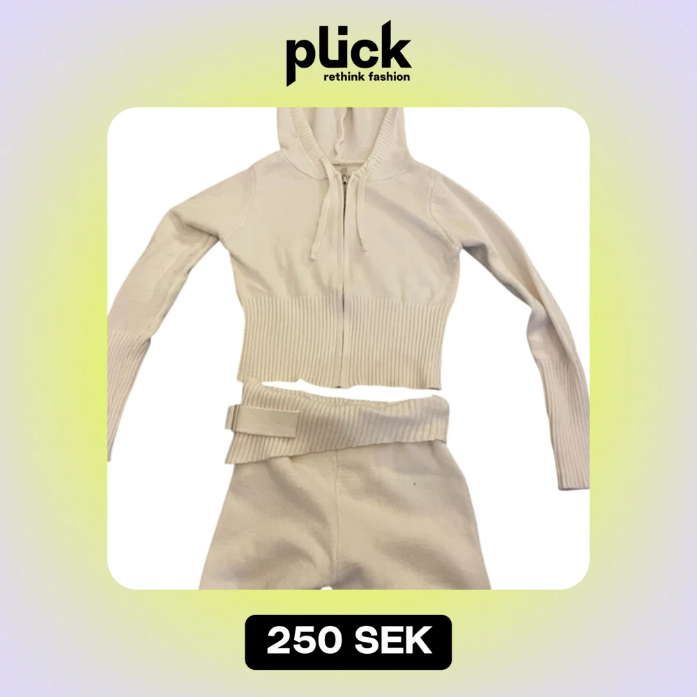 Säljer en superfin beige croppad hoodie med matchande byxor. Hoodien har dragkedja och ribbade detaljer, samt en snygg huva med knytband. Byxorna har en bred ribbad midja innerben 69 cm. Perfekt för en chill dag eller en avslappnad ut
